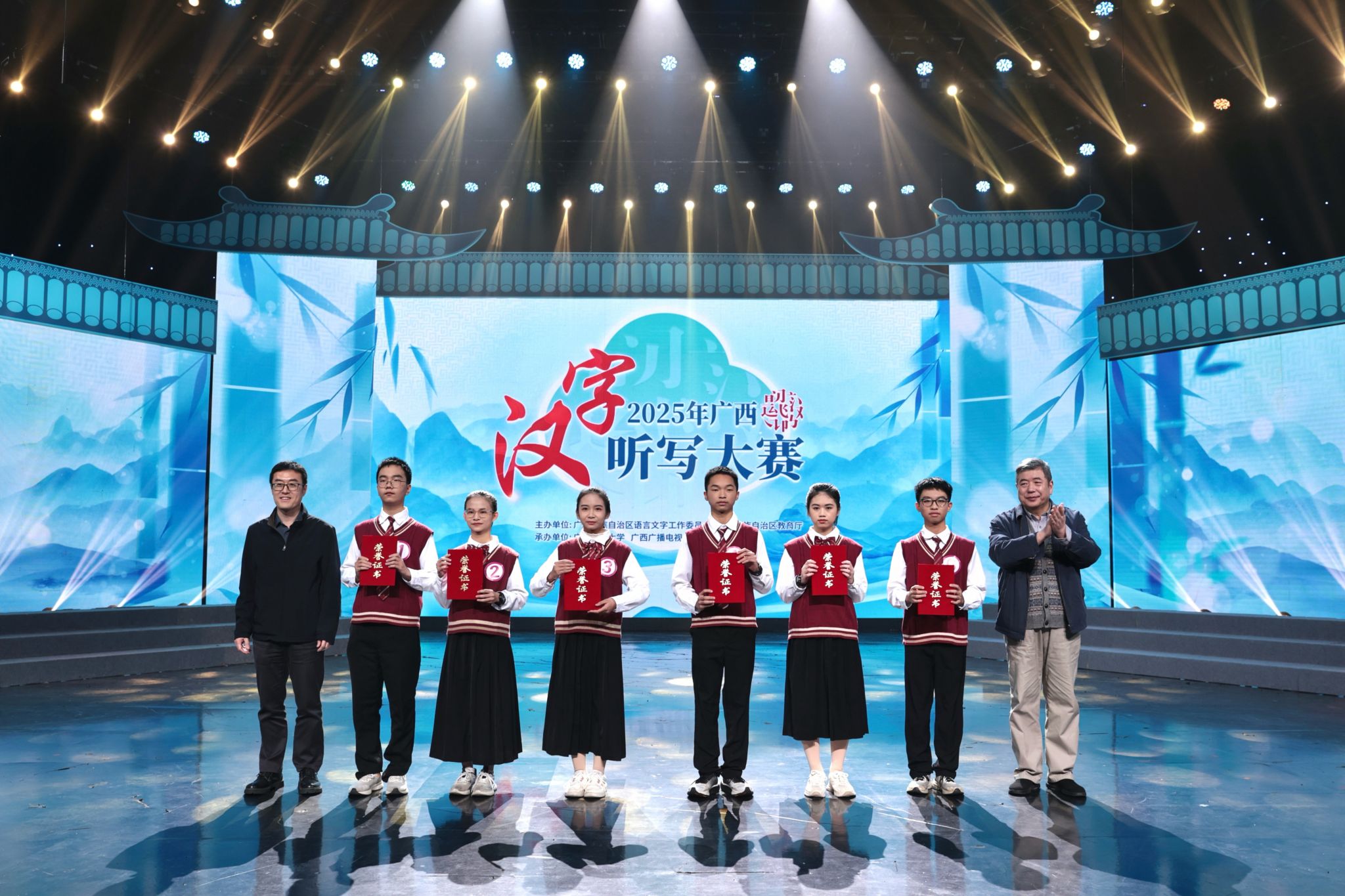 颁奖环节,教育部语言文字应用管理司原副司长、教育部语言文字应用研究所原所长张世平,beat365英国官方网站党委书记唐平秋,自治区教育厅副厅长张元良,广西广播电视台副台长马继霞,自治区教育厅语言文字工作处处长黄凯,教育部语言文字应用研究所研究员、中央广播电视总台中国汉字听写大会文化嘉宾张一清,中国教育电视台制片人马惠玲,南宁师范大学文学院教授莫山洪,广西师范大学文学院教授肖瑜,beat365英国官方网站文学院教授李惠玲,分别为获奖队伍颁奖。