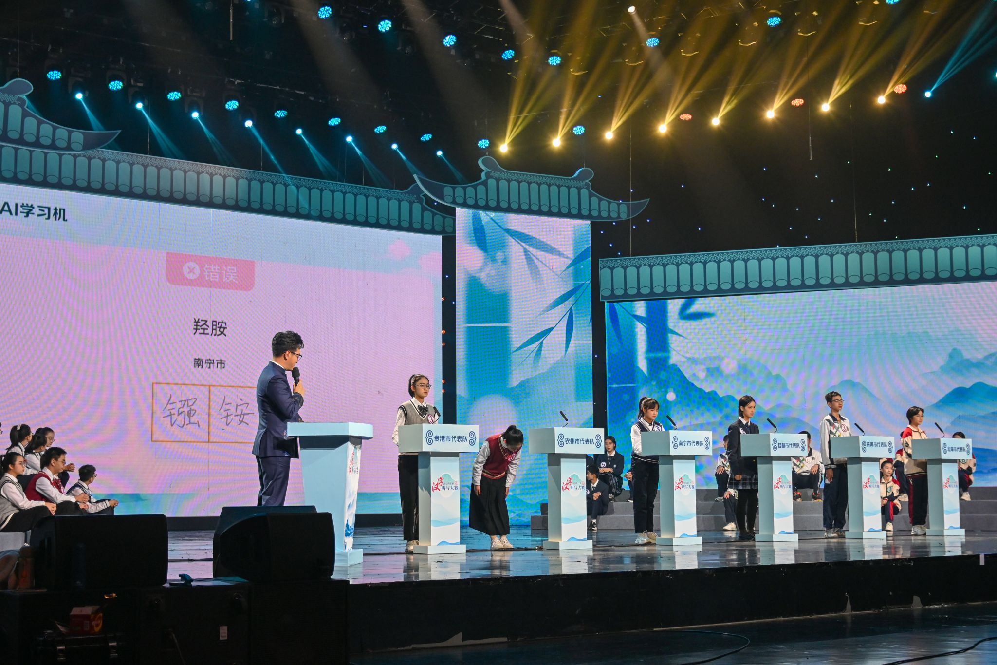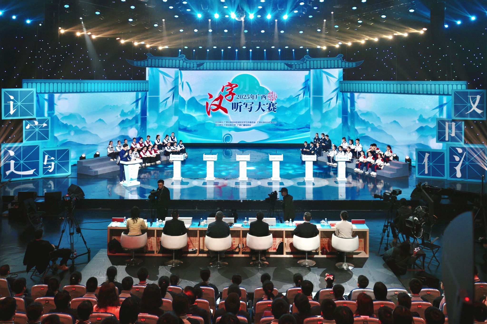 本届大赛全区14个市通过前期选拔,分别组成了由6名多民族(含2个民族及以上)参赛选手、1至2名指导老师和1名领队构成的参赛队伍。赛程设置复赛、半决赛和决赛三个阶段,采取“14进10、10进6、6进3、3进1”的递进式赛制。复赛将14支队伍分为两组,经分组赛与复活赛产生10支晋级队伍;半决赛10支队伍继续分组对决,最终决出6支队伍进入决赛;决赛分两轮进行,首轮“6进3”确定一、二等奖候选队伍,第二轮“3进1”决出最终冠军。比赛采用回合制与淘汰制结合的形式,选手须在30秒答题时间内于手写板上用规范汉字书写答案,结果由现场评委裁定。试题涵盖汉字听写、汉字注音、看音写字、古文字识别等多种类型,全面考查选手的汉字识写能力与传统文化素养。