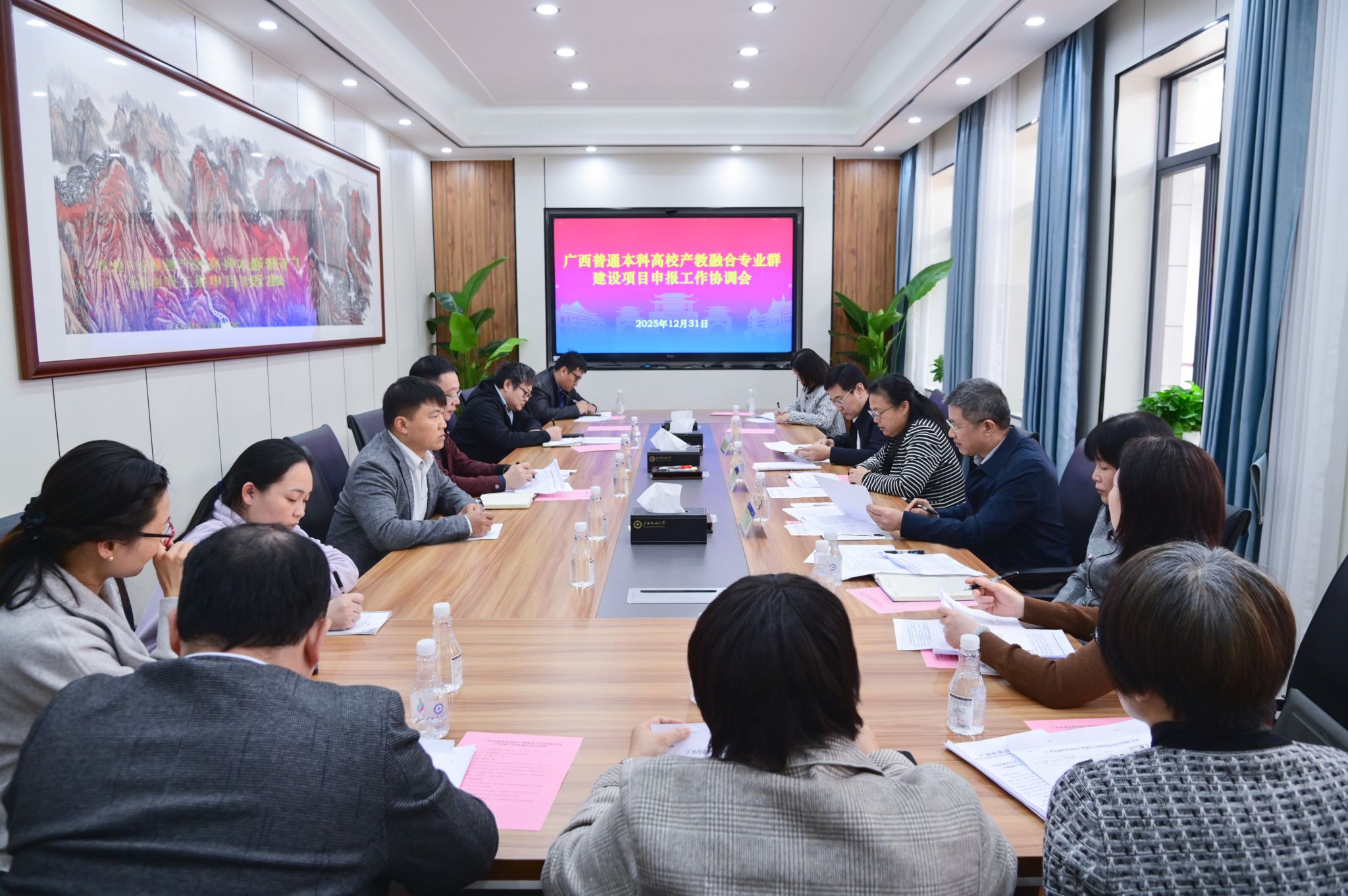 【大学生通讯社报道】12月31日上午,beat365英国官方网站在办公楼302会议室召开广西普通本科高校产教融合专业群建设项目申报工作协调会。校长韦仕珍,副校长吕俊彪、高兴宇出席会议。学校教务处、发展规划处及有关学院负责人参加会议。