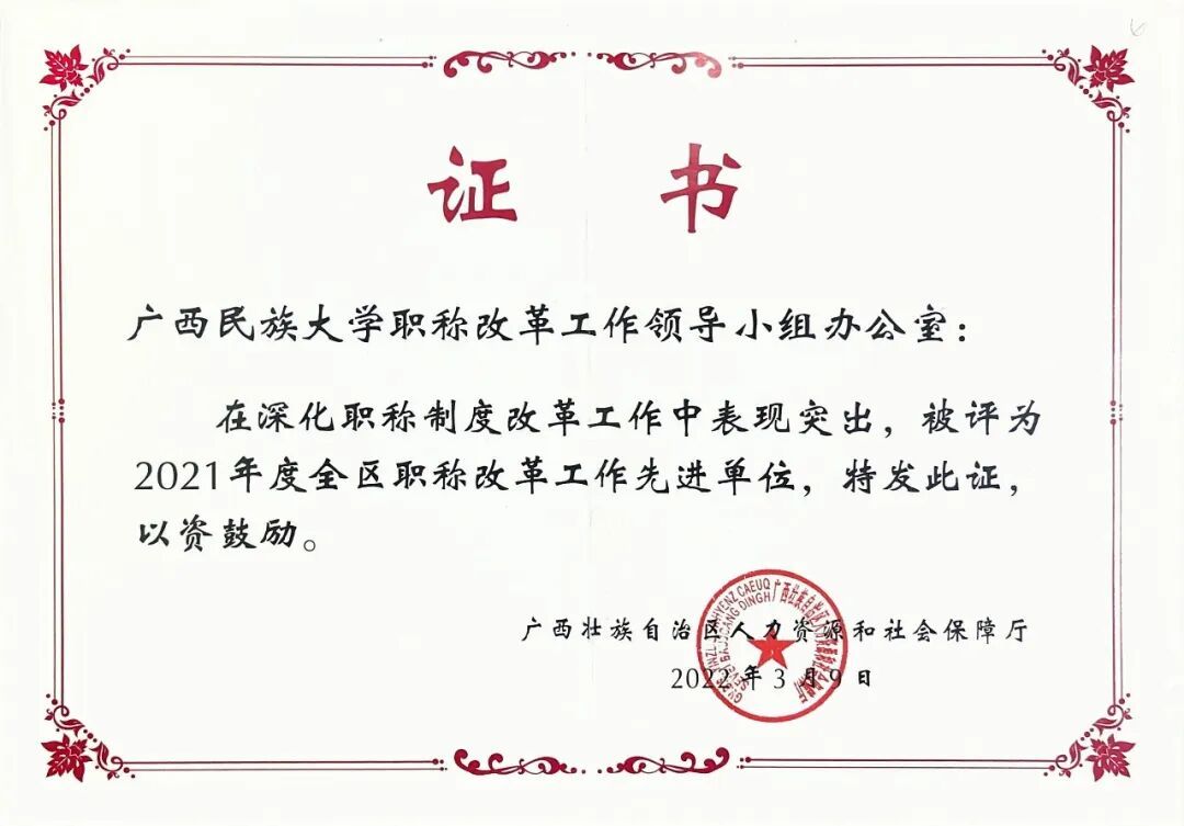 “十四五”时期,完成职称评审380人次、认定348人次,588人晋升职称,学校职称改革工作领导小组办公室被评为2021年度全区职称改革工作先进单位和2023年度全区职称改革工作成绩突出单位。