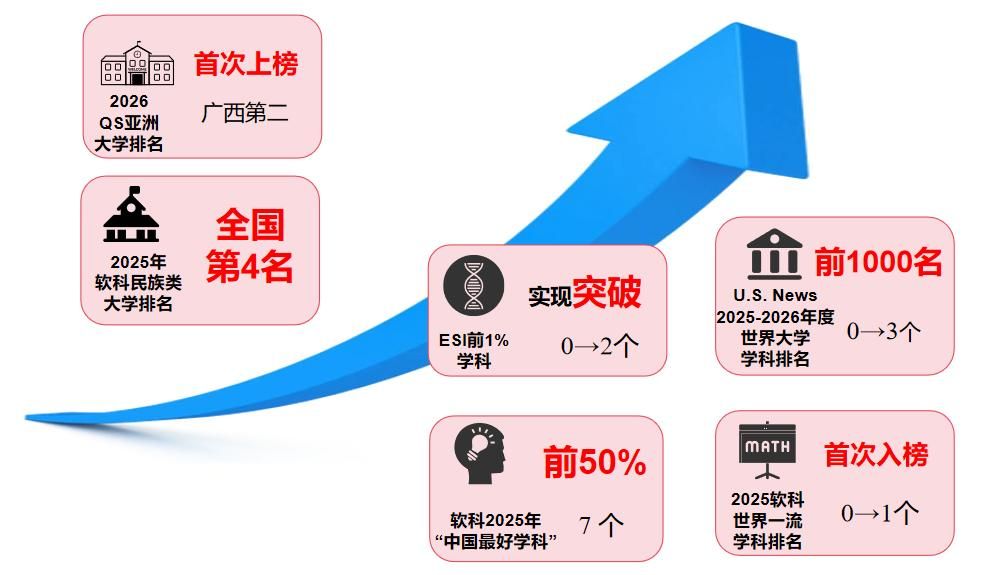 2025年11月,学校首次进入QS亚洲大学排名,位列广西第二;在2025软科民族类大学排名中位列第4。第五轮全国学科评估、全国专业学位水平评估中取得新突破,6个学科分别进入前70%及以上,其中3个学科实现历史性突破,尤其是民族学在第四轮全国学科水平评估结果B的基础上实现重大突破。学科国际影响力进一步提升,2023年7月工程学进入ESI全球前1%,实现零的突破;2024年5月化学相继进入ESI全球前1%。3个学科入选2025-2026年度U.S.News世界大学学科排名。2025年1个学科(数学)首次跻身软科世界一流学科排名,7个学科上榜软科2025“中国最好学科”,其中民族学位列全国第5。