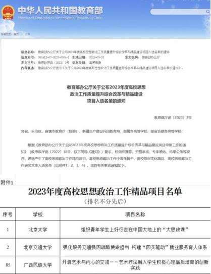 《开启艺术与内心的交流——艺术疗法融入学生积极心理品质培育的创新实践》项目入选教育部2023年度高校思想政治工作精品项目。