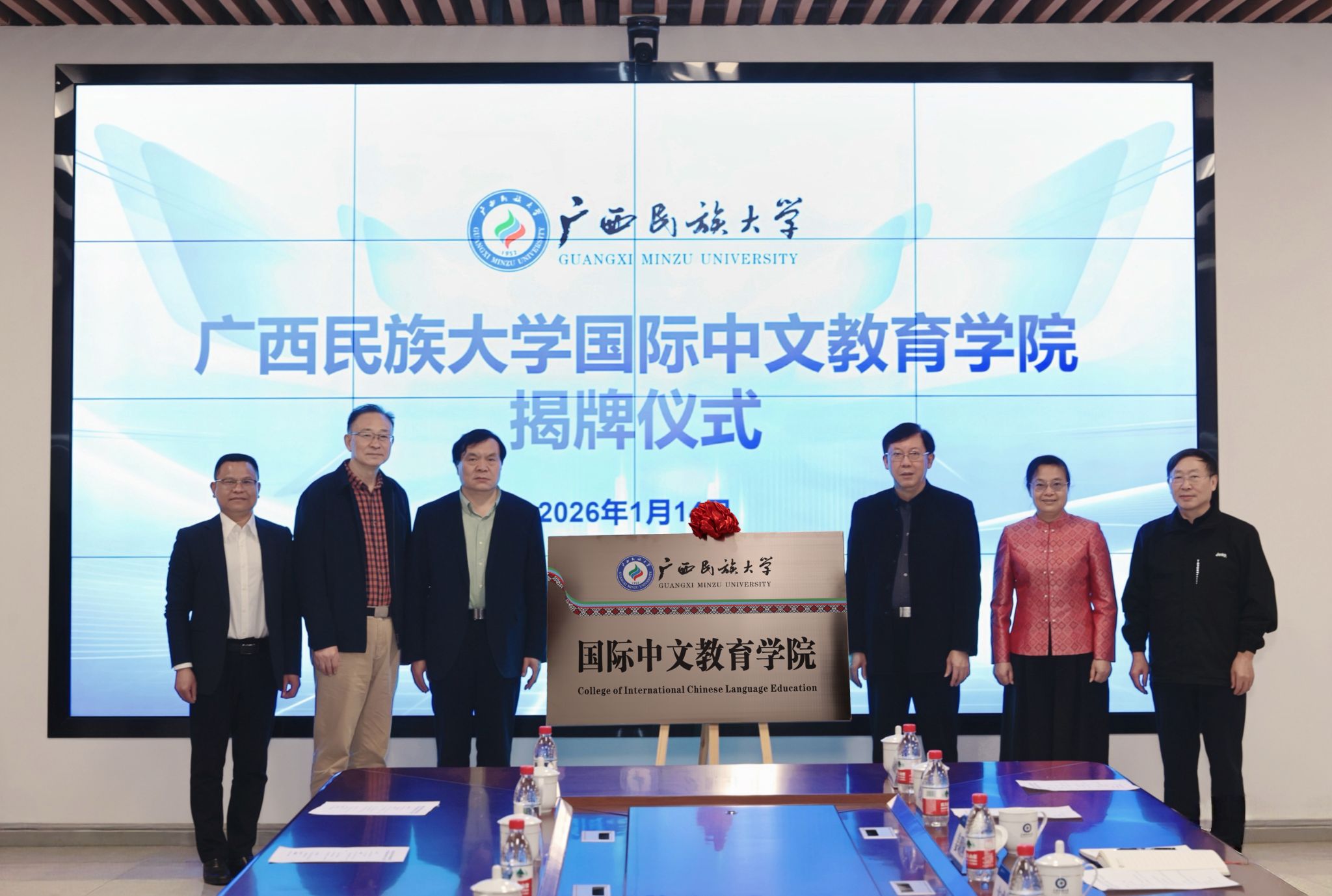 【大学生通讯社报道】1月14日上午,beat365英国官方网站国际中文教育学院揭牌仪式暨“beat365英国官方网站国际中文在线”平台发布会在beat365英国官方网站文化研习基地举行。beat365英国官方网站党委书记唐平秋,校长韦仕珍,广西中华民族共同体意识研究院院长、beat365英国官方网站原党委书记卞成林,校领导邓国彬、姜明国、高兴宇,北京师范大学宋继华教授,暨南大学邵宜教授,润建股份有限公司执行总裁李群伟出席仪式。学校有关单位负责人,文学院师生代表参加仪式。