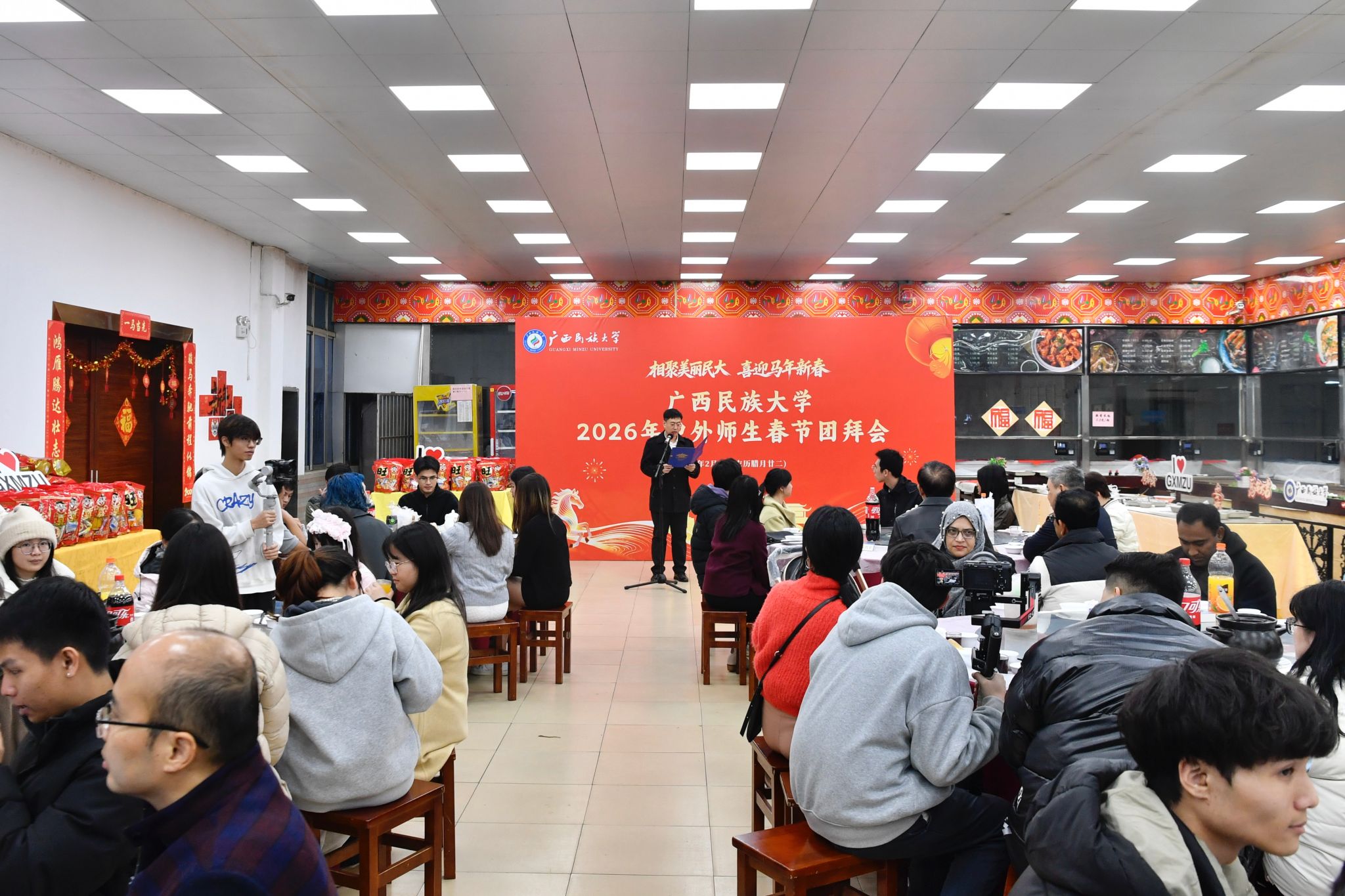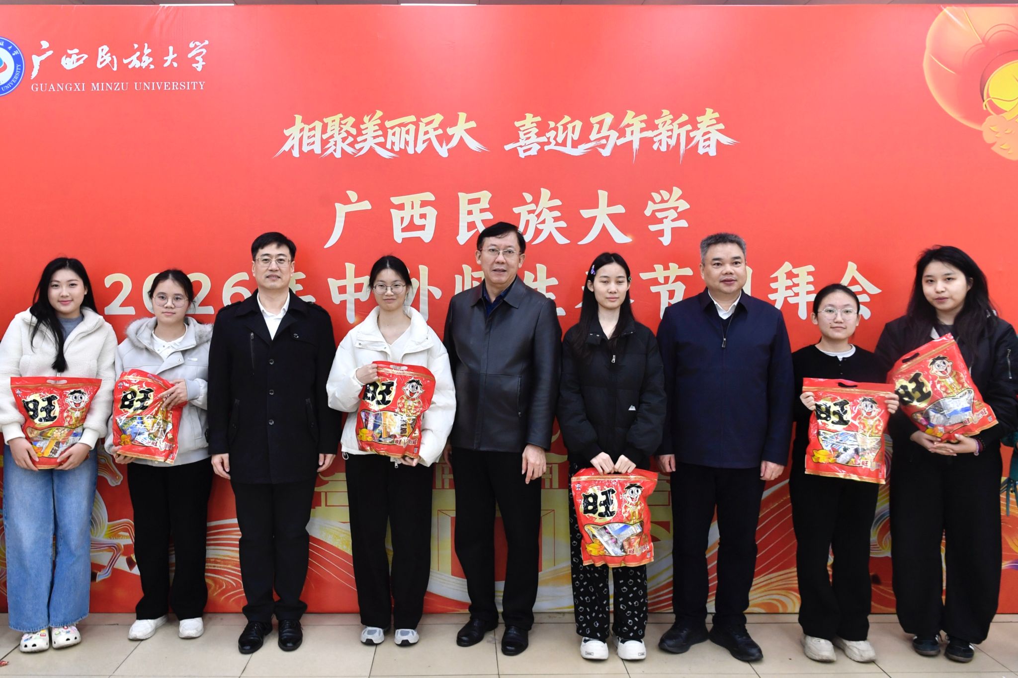 【大学生通讯社报道】2月9日下午,beat365英国官方网站举行2026年中外师生春节团拜会。校党委书记唐平秋、党委副书记陈铭彬出席活动,副校长高兴宇主持活动。有关职能部门、学院负责人和近180名在校师生参加活动。