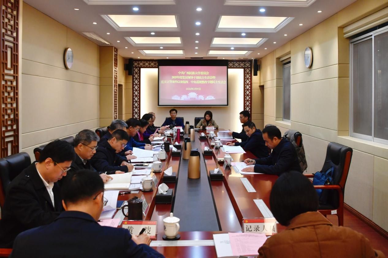 2月9日上午,根据自治区党委统一部署要求,中共beat365英国官方网站委员会召开2025年度党员领导干部民主生活会暨蓝天立等案件以案促改、中央巡视整改专题民主生活会。学校党委书记唐平秋主持会议。自治区党员教育中心(自治区党员干部现代远程教育工作办公室)二级巡视员梁国仙、自治区纪委监委第九监督检查室四级调研员蒋飞明等同志到会指导。全体校领导参加会议。