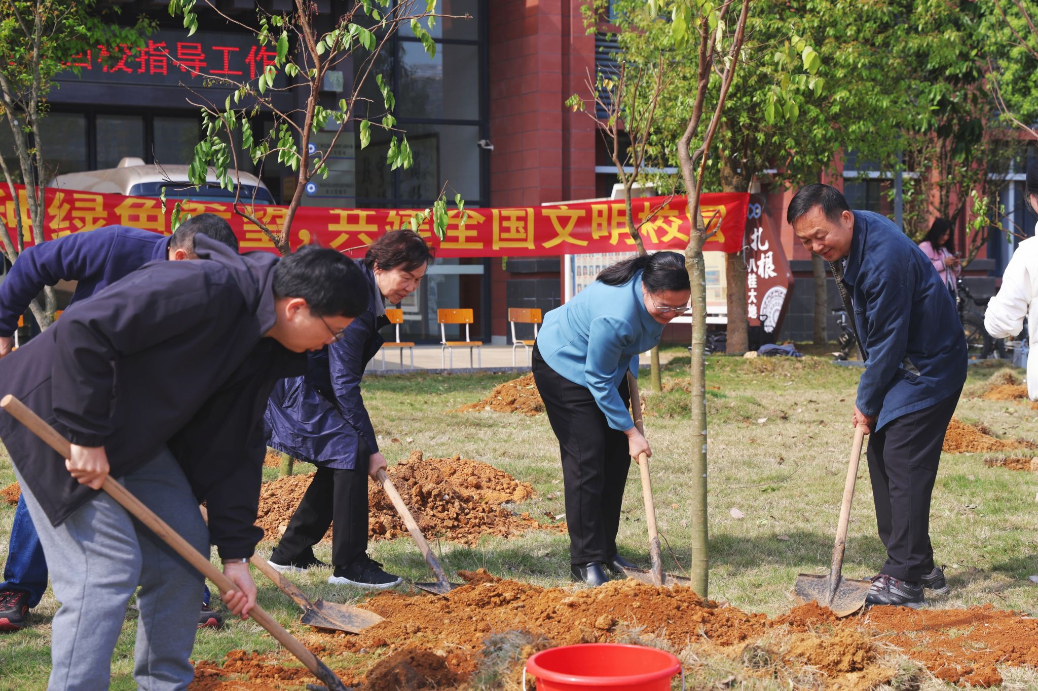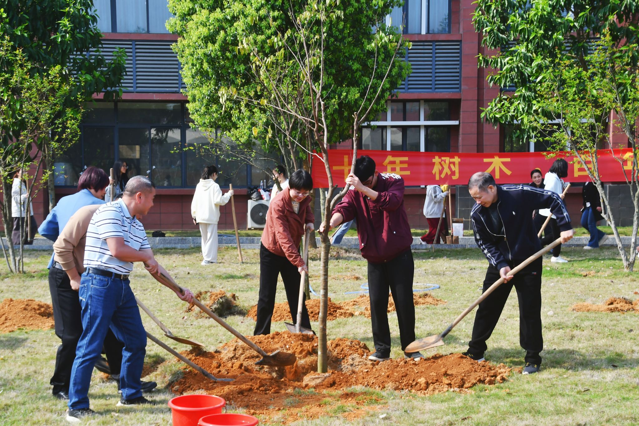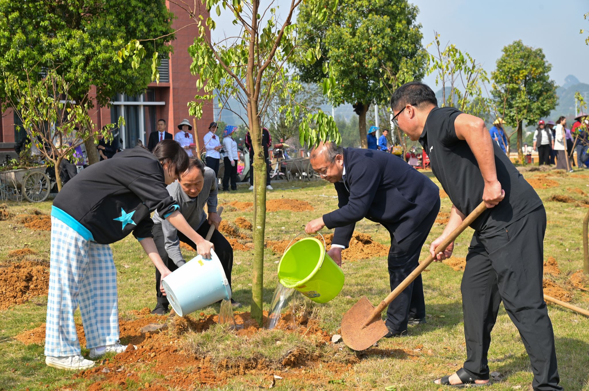 植树现场,师生们热情高涨,分工协作,挥锹铲土,扶苗培土,提水浇灌,合力种下一棵棵象征希望的幼苗。在师生的共同努力下,80棵台湾四季红杨桃成功“安家落户”,为春日校园增添一抹新绿。