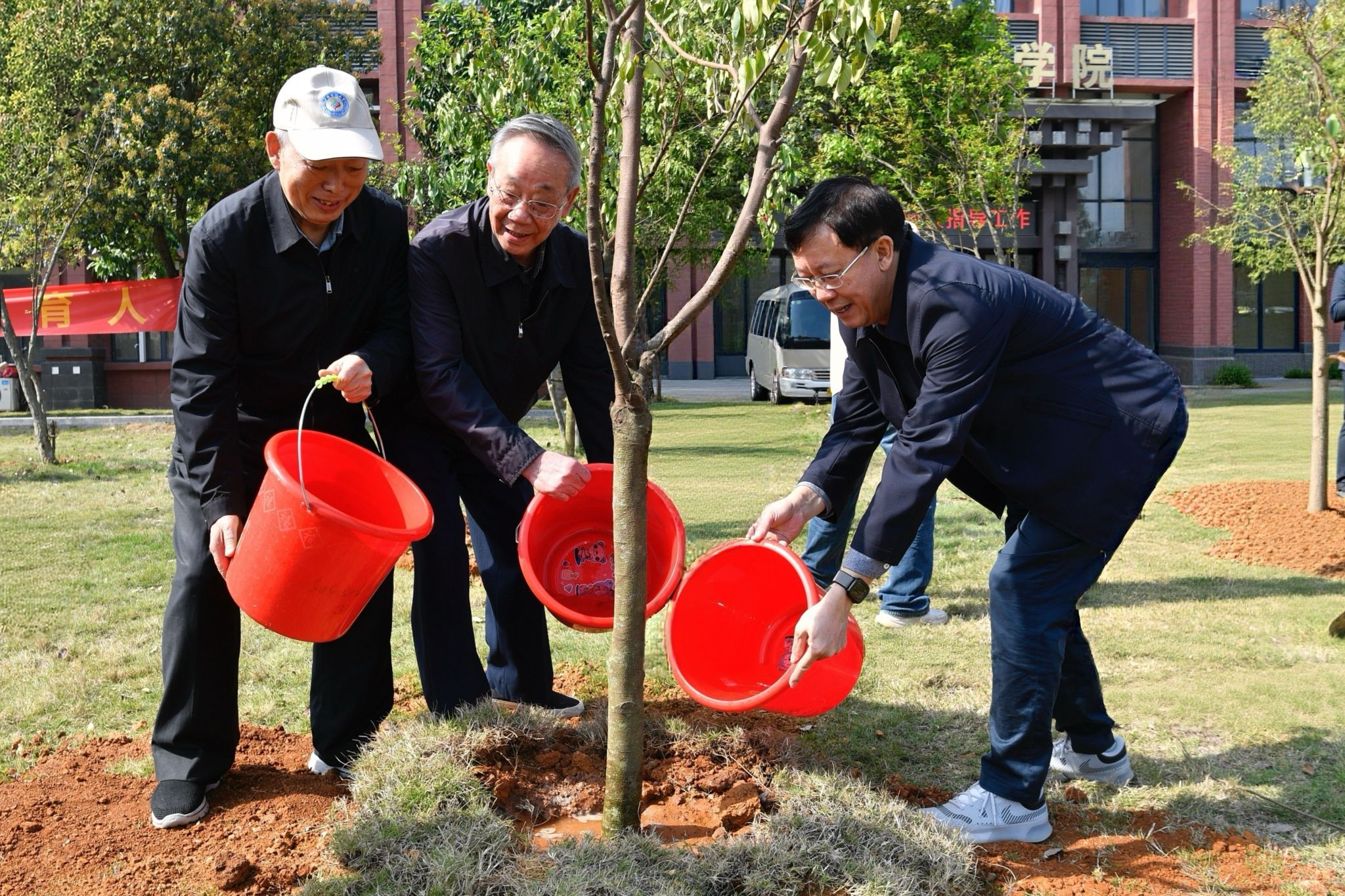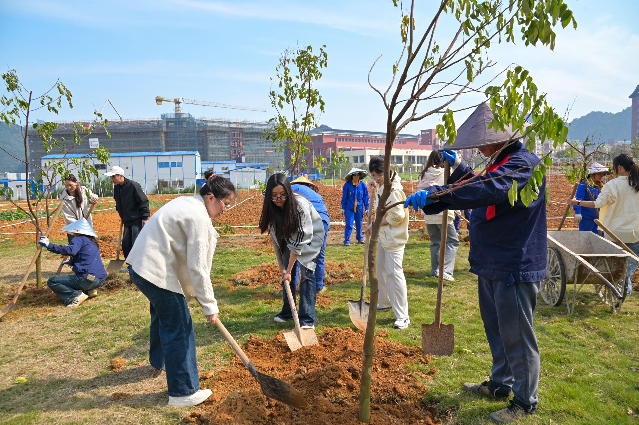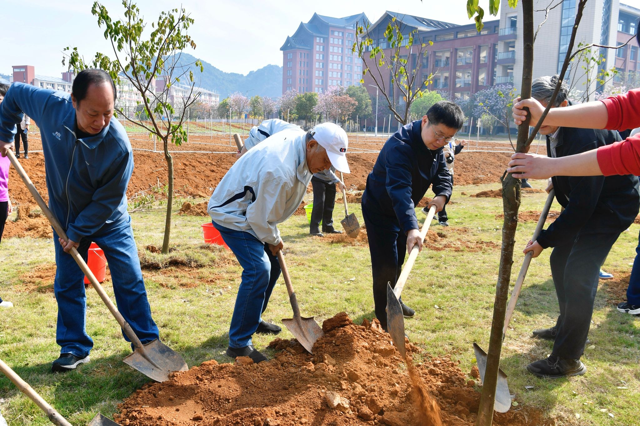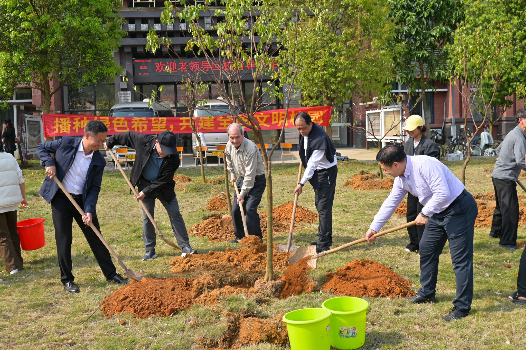 植树现场,师生们热情高涨,分工协作,挥锹铲土,扶苗培土,提水浇灌,合力种下一棵棵象征希望的幼苗。在师生的共同努力下,80棵台湾四季红杨桃成功“安家落户”,为春日校园增添一抹新绿。