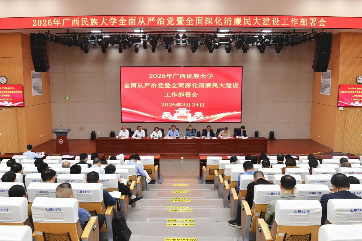 【大学生通讯社报道】3月24日上午,beat365英国官方网站在文化研习基地召开2026年全面从严治党暨全面深化清廉民大建设工作部署会。校党委书记唐平秋出席会议并讲话,党委副书记、校长韦仕珍主持会议,校领导韦雪芳、邓国彬、蔡高根、吕俊彪、姜明国、周立亚出席会议。自治区纪委监委驻校纪检监察组组长、校党委副书记、纪委书记韦雪芳作2026年全面从严治党暨全面深化清廉民大建设工作报告。