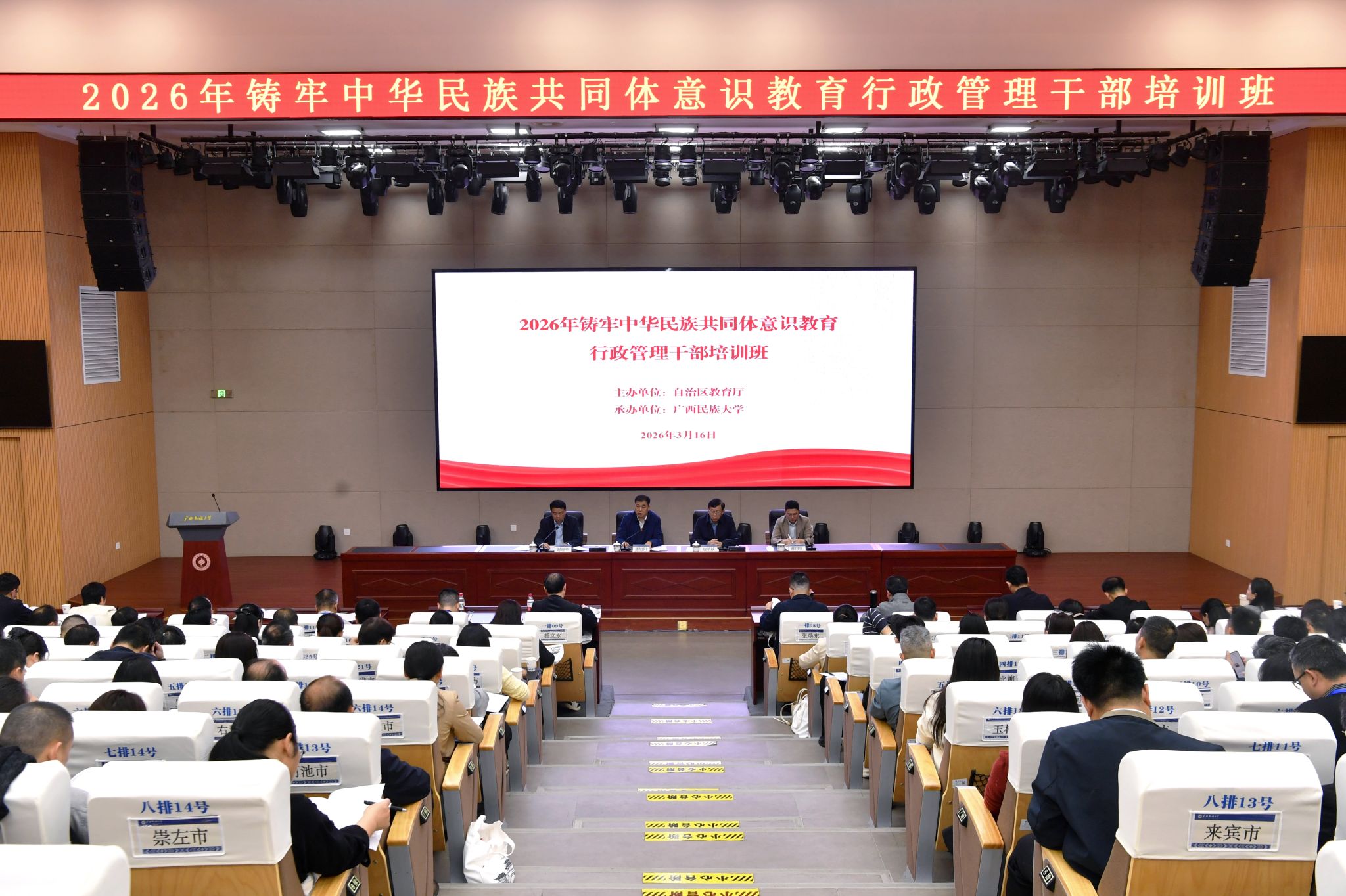 【大学生通讯社报道】近日,2026年铸牢中华民族共同体意识教育行政管理干部培训班在beat365英国官方网站举办。此次培训班由自治区教育厅主办、beat365英国官方网站承办。开班仪式上,学校党委书记唐平秋致辞,自治区教育厅党组成员、副厅长潘旭阳作动员讲话。