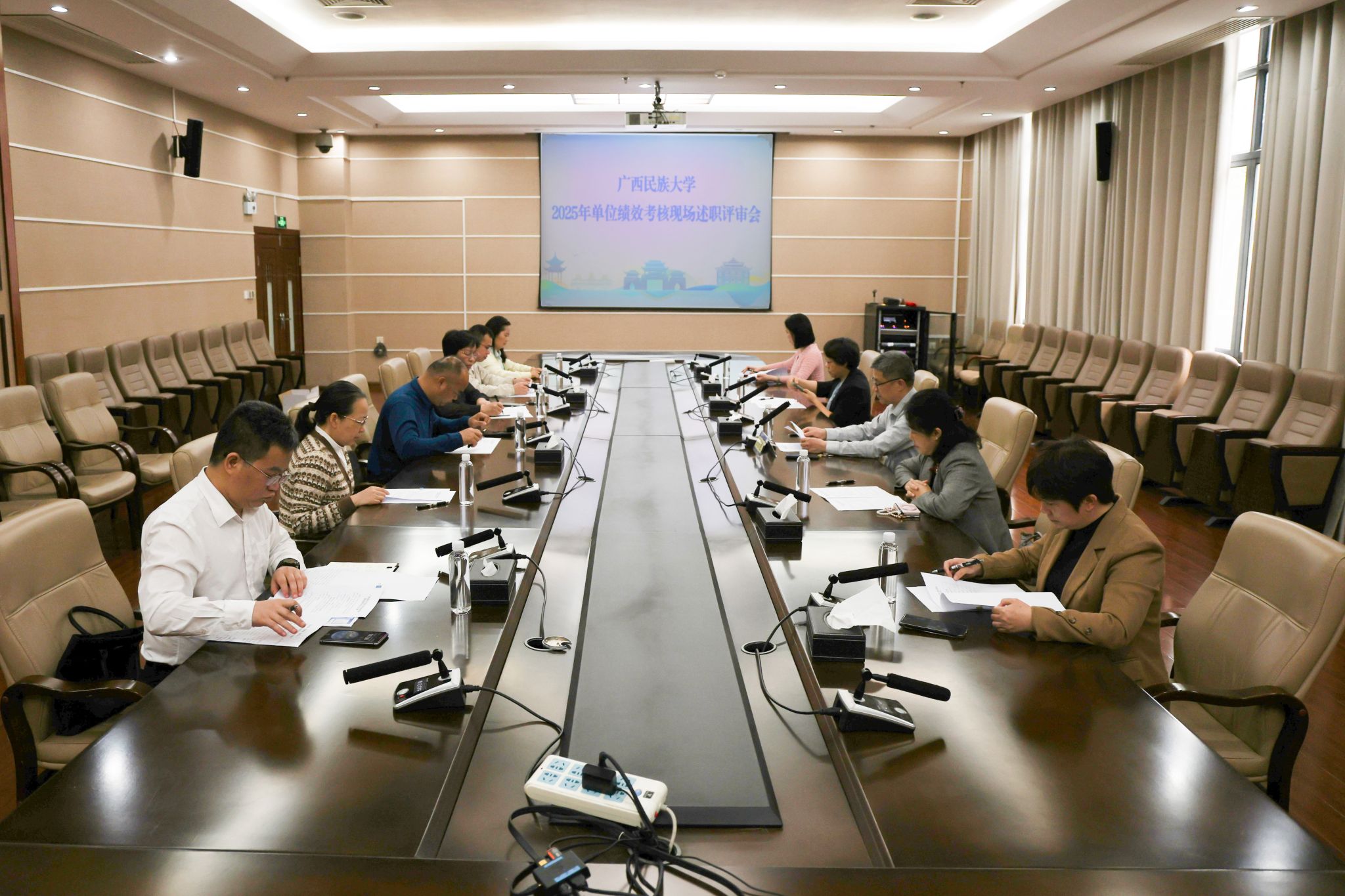 3月23日,校党委常委、副校长吕俊彪主持召开学校2025年单位绩效考核现场述职评审会,由学校领导、职能部门负责人和学院负责人组成的评审小组,对2025年单位绩效考核网上评分结果符合一等条件的单位和申请获批参加现场述职的单位进行现场考评,并投票初定等次,投票结果将报学校审核确定最终等次。(初审/周娟 图文/凌思宇 编辑/梁晶晶 实习编辑:梁火琼 樊甲利 复审/韦利坤 终审/孙寿媚)