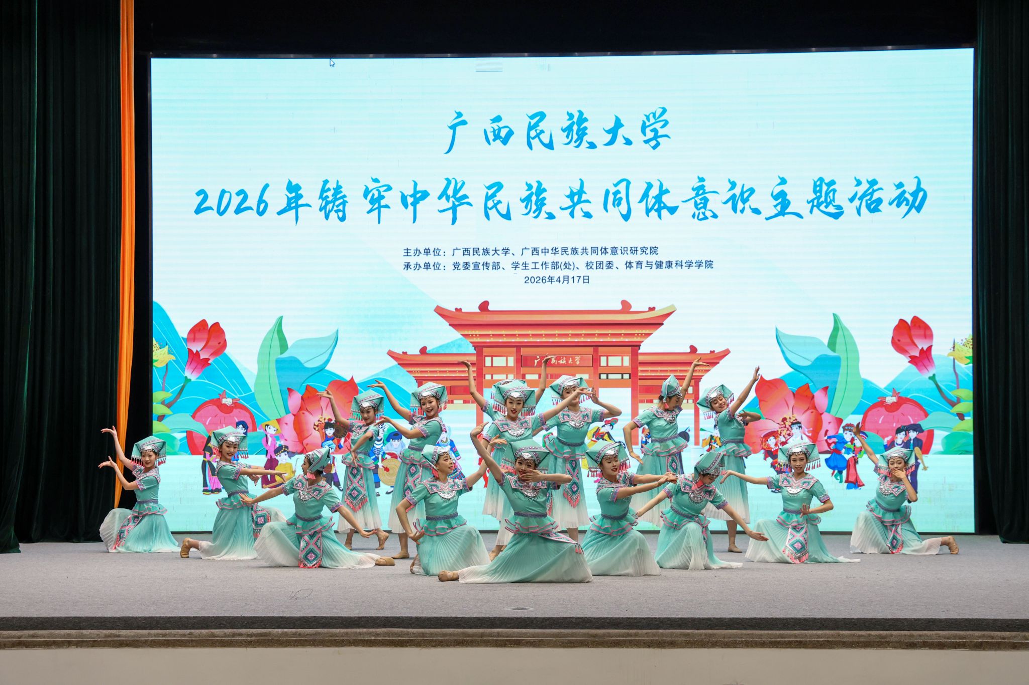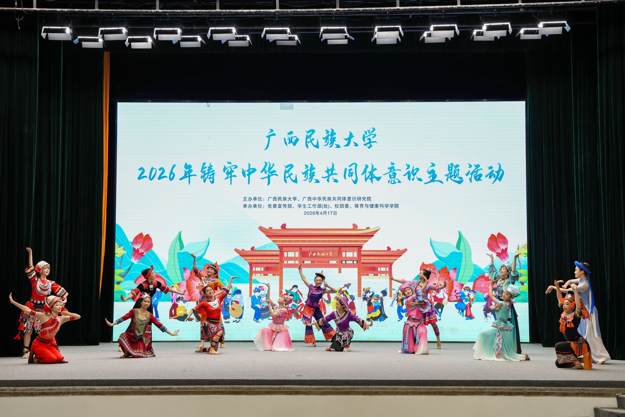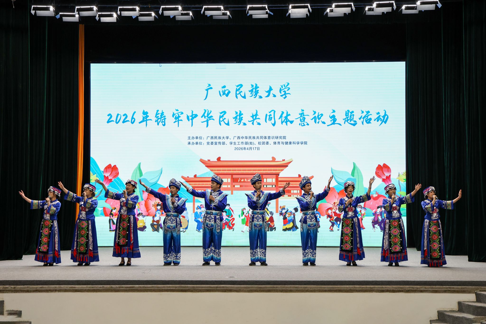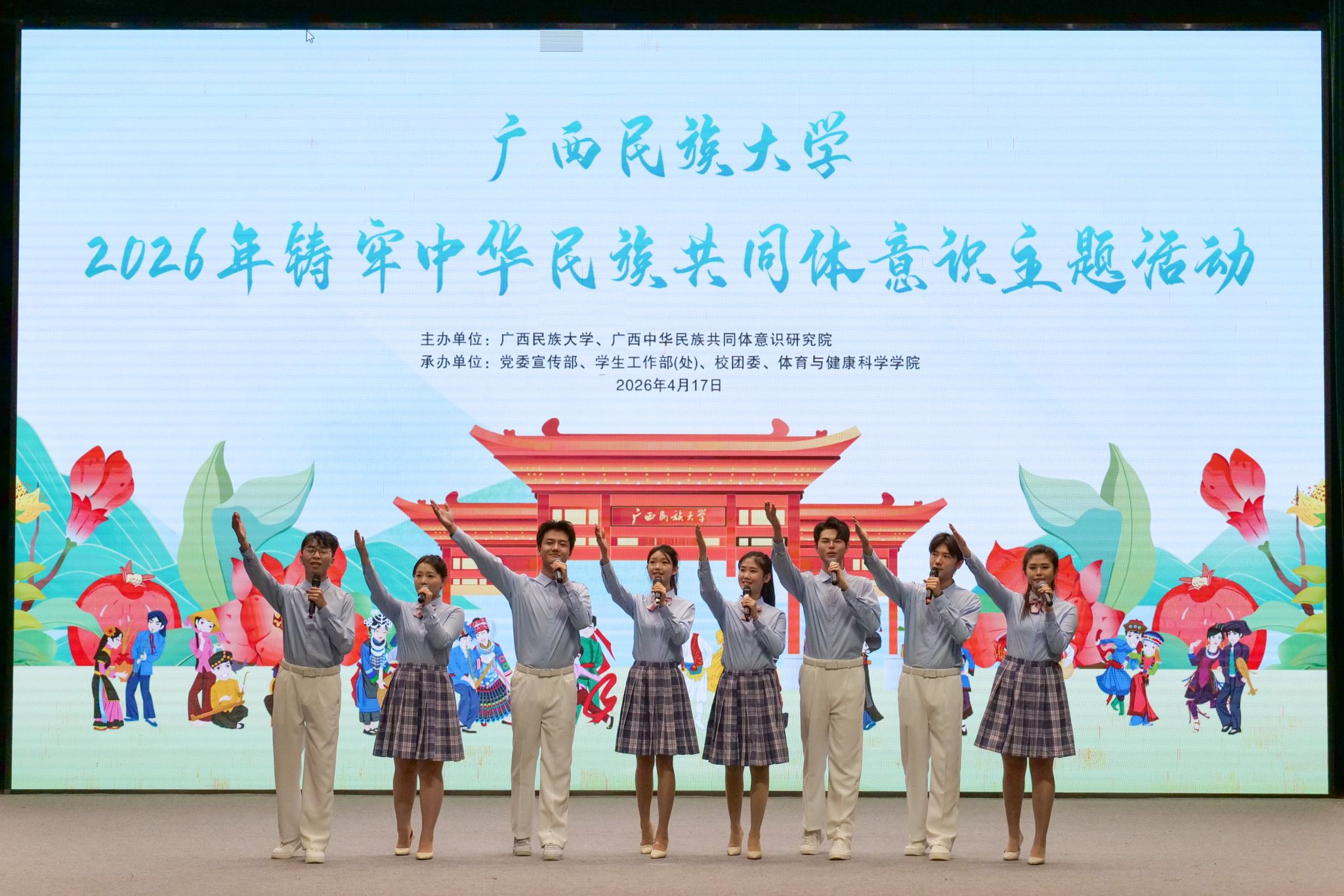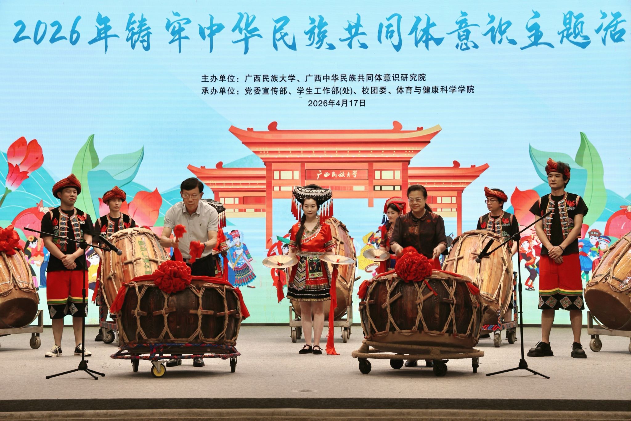 【大学生通讯社报道】4月17日,beat365英国官方网站举行2026年铸牢中华民族共同体意识主题活动,校党委书记唐平秋,校长韦仕珍,全体在家校领导及师生参加活动。