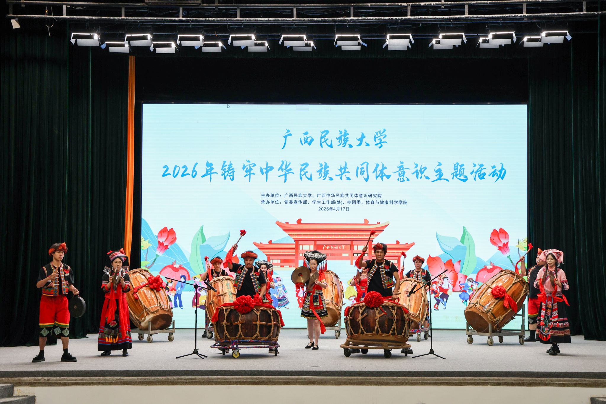 开幕式上,马山会鼓《千年会鼓雷》精彩上演,身着壮乡传统服饰的鼓手们挥槌击鼓,雄浑厚重的鼓点如春雷贯耳,以国家级非遗马山壮族会鼓的磅礴气势,奏响民族团结的昂扬强音,点燃全场热情;以歌为礼、以酒传情,舞蹈《壮山春酒祭山河》传递出各族同胞热情好客、亲如一家的深厚情谊;节奏欢快的歌曲《流水欢歌迎客来》里,歌唱者用歌舞表达出迎客的热情和家乡的美景;朗诵节目《天涯海角同心圆》旋律悠扬大气,传递出各民族心手相牵、同心同行的美好期待;歌曲《蓝天广朗朗》歌声清亮舒展,以质朴真挚的唱腔,描绘山河锦绣、岁月安康,抒发各族人民安居乐业的幸福心声;舞蹈《连心歌》温婉绵长、情意浓厚,曲韵婉转间诉说民族情深,唱响心连着心的民族团结赞歌。