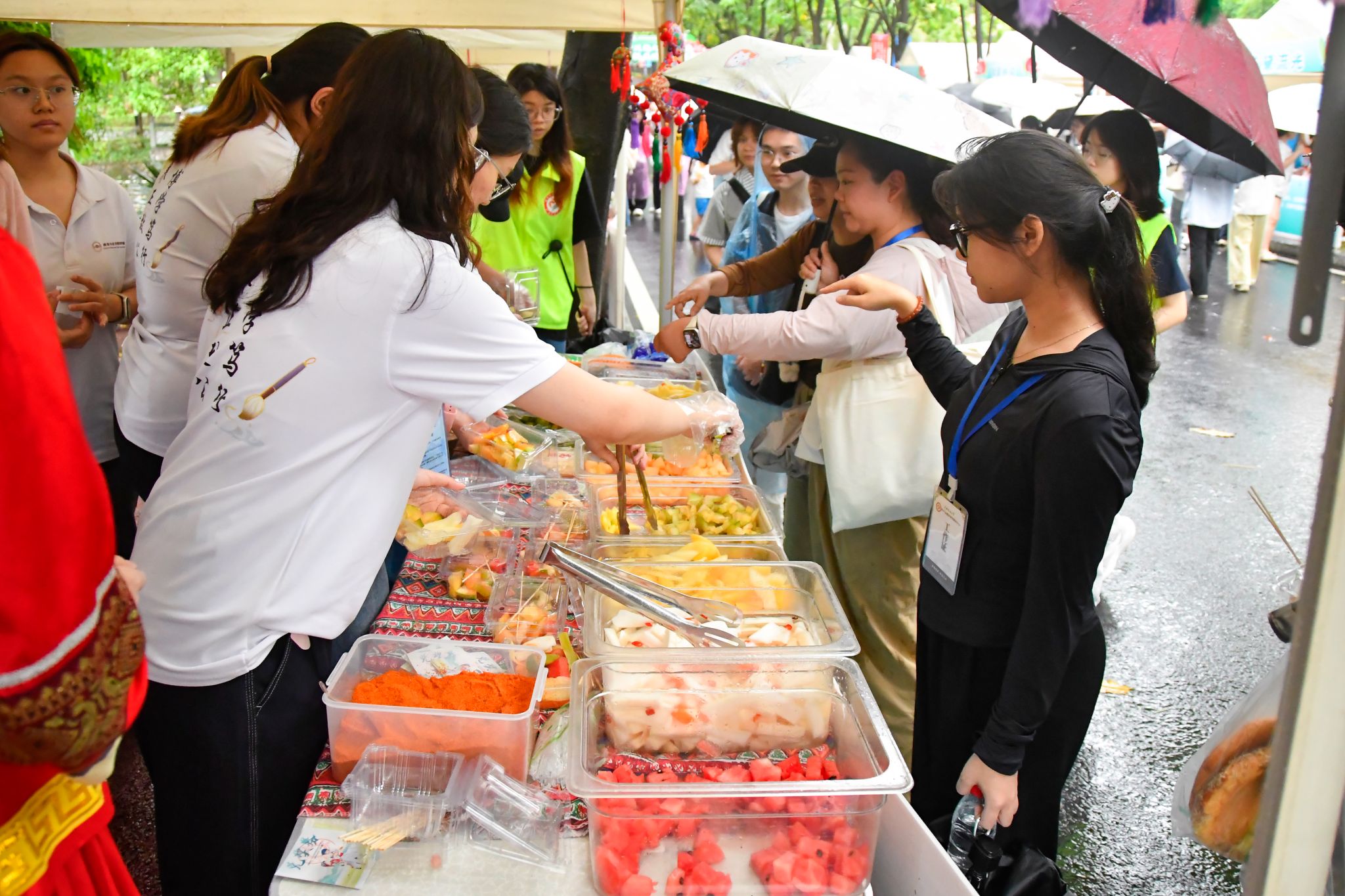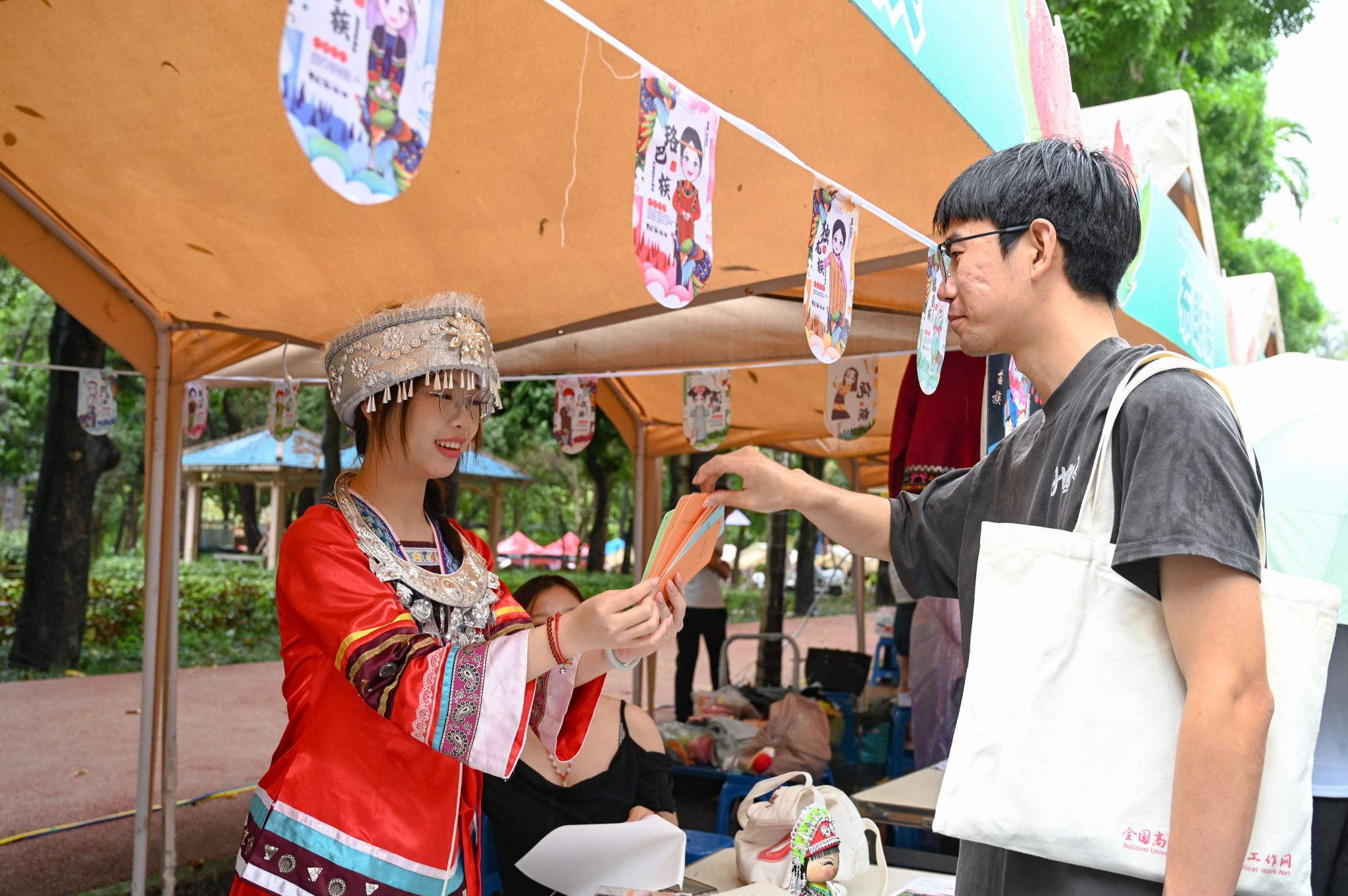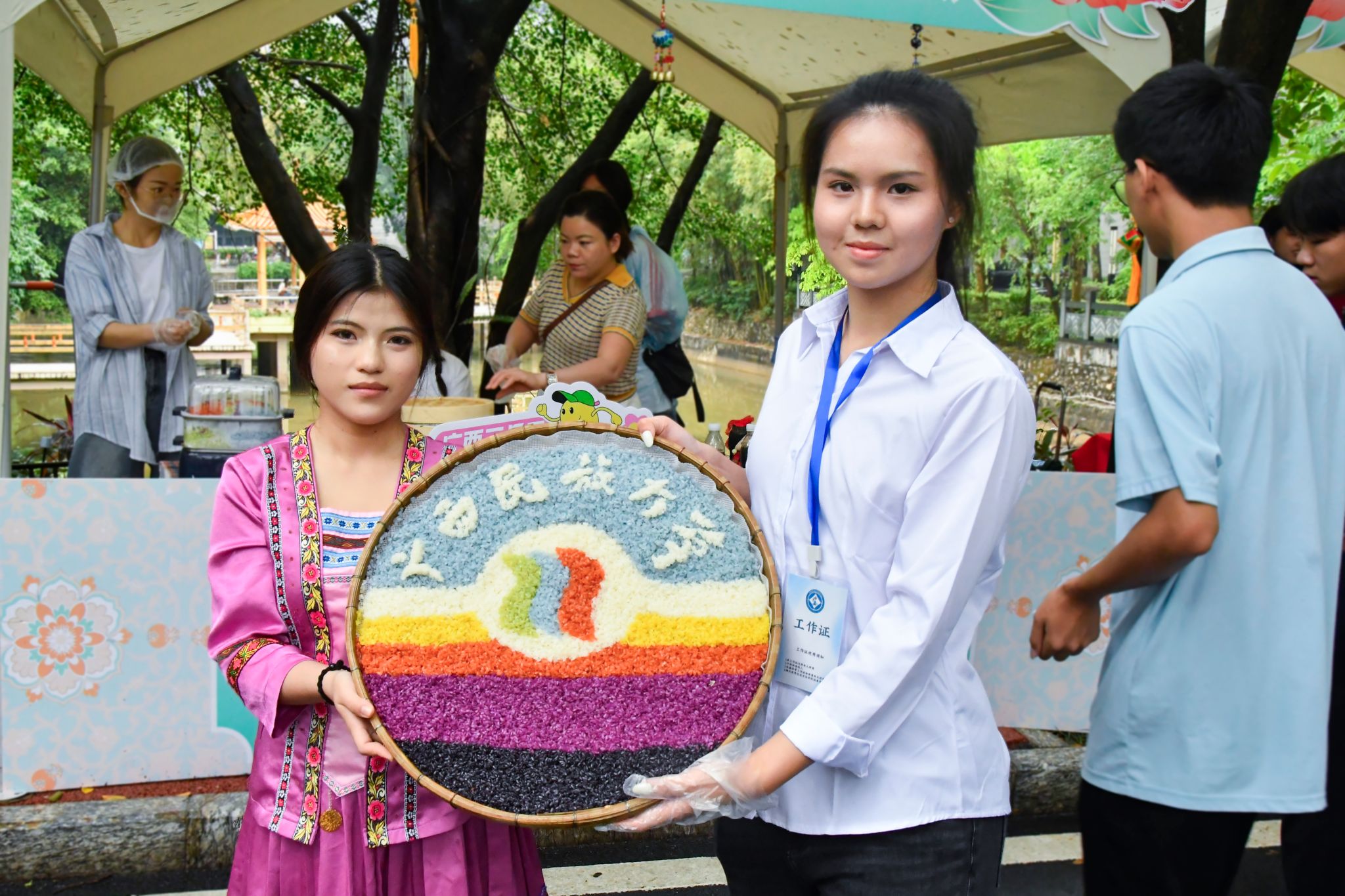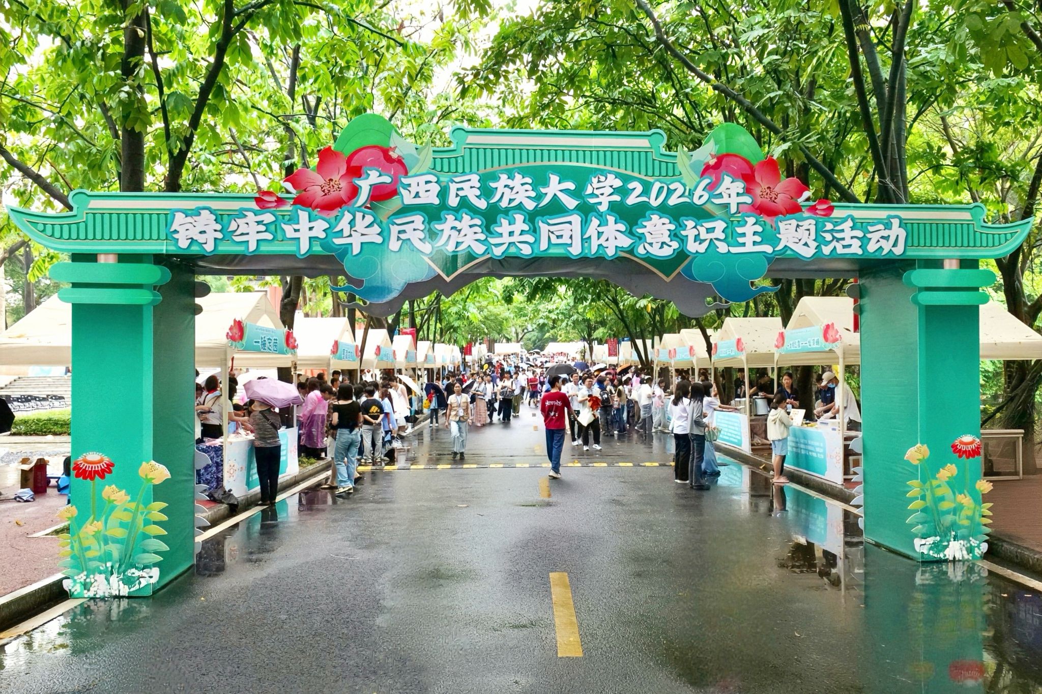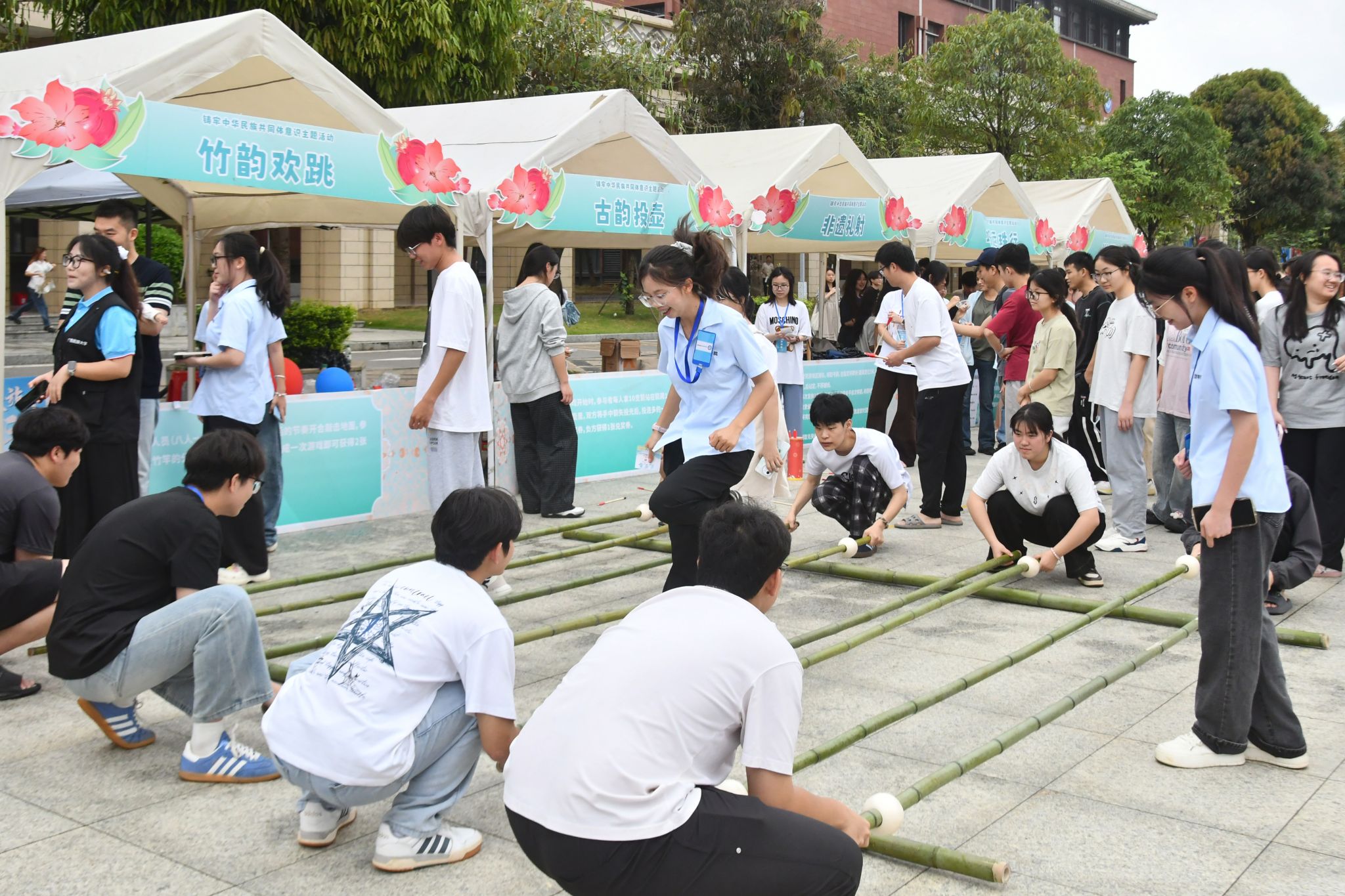 本次活动设民族风情展示区、民族游戏畅玩区、非遗手工制作区、民族美食区等板块。壮锦织造、铜鼓拓印、蜡染扎染、绣球彩绘等非遗手作琳琅满目,五色糯米饭与酸嘢的滋味在舌尖流转,56顶民族帐篷如繁花绽放,师生或织或画,或品或玩,欢声笑语充满校园,通过活动生动展现民族文化,不断夯实铸牢中华民族共同体意识的基础。(初审:张佳 复审:韦利坤 终审:孙寿媚)