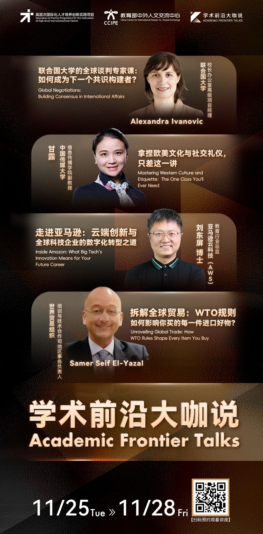 为积极响应国家关于加快国际化创新人才培养的号召,助力学子拓展全球视野、锻造未来竞争力,2025年秋季“学术前沿大咖说”讲座如约而至。首期将特邀联合国大学(UNU)、世界贸易组织(WTO)、亚马逊云科技(AWS)、中国传媒大学四大平台的主讲人,带你从实战视角解锁全球经济、国际沟通、云端技术、跨文化社交的核心能力。