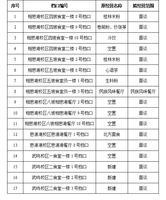 1.档口:本次公开选择的档口共计17个,均为食堂室内餐饮类档口。