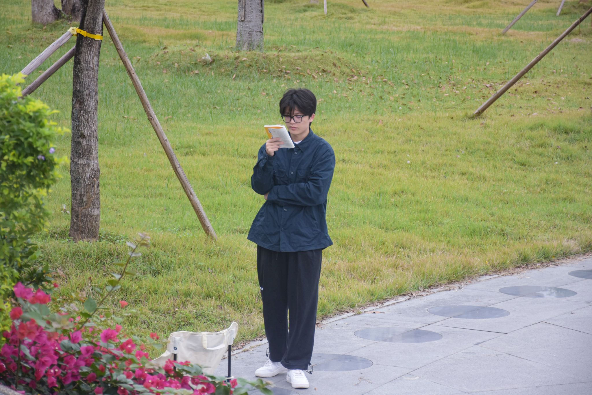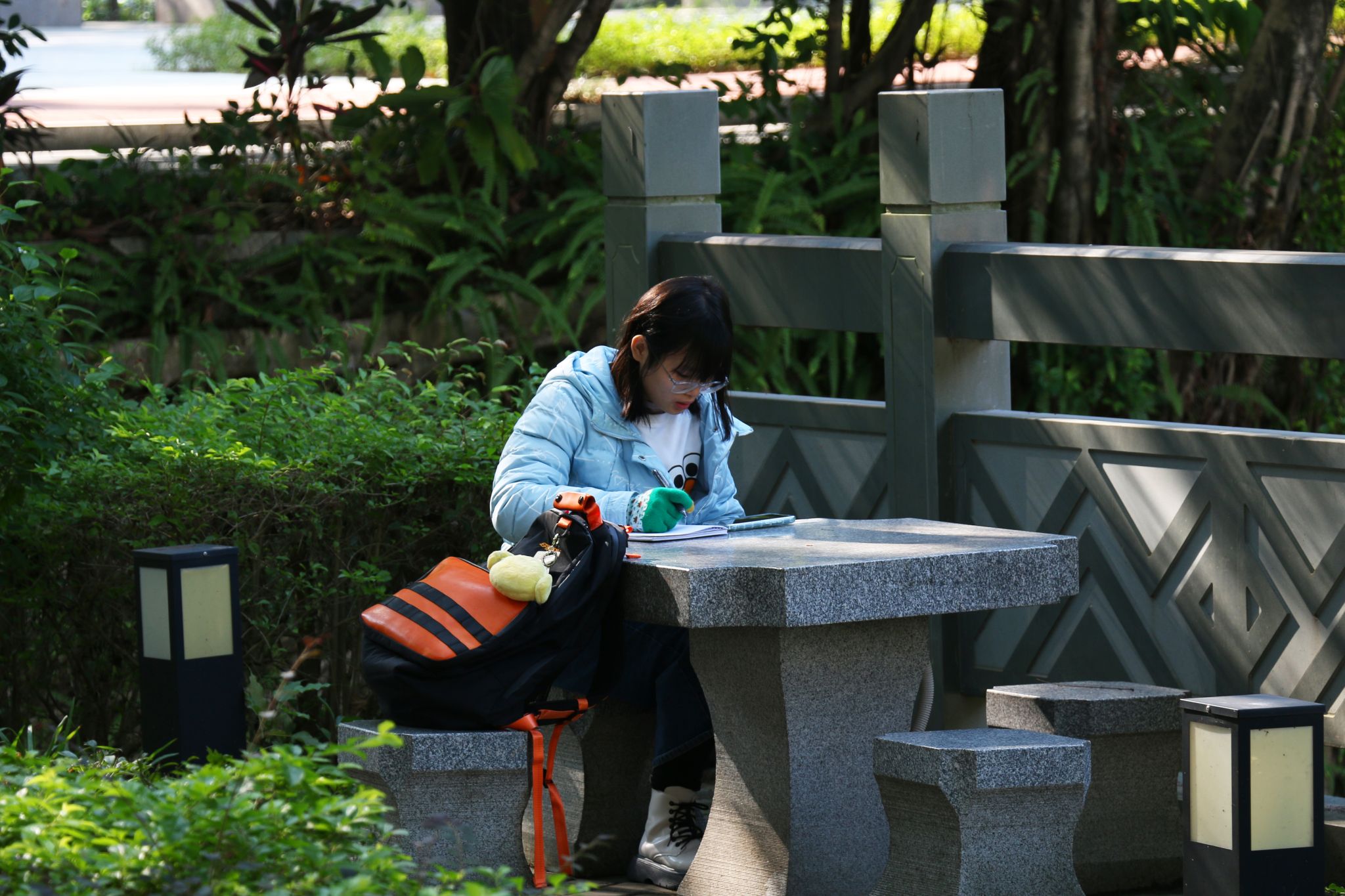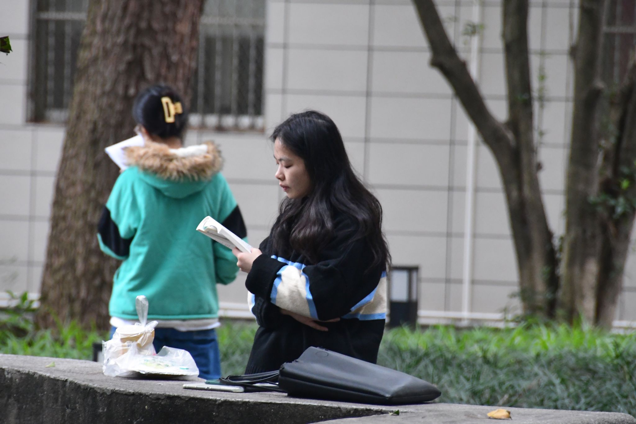 图书馆楼下学生背书