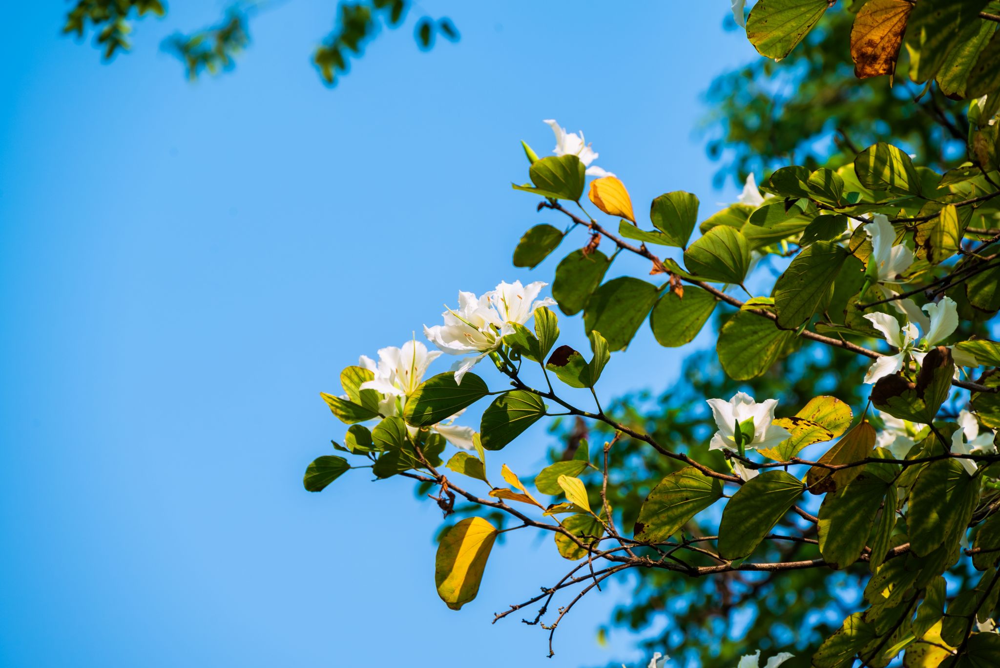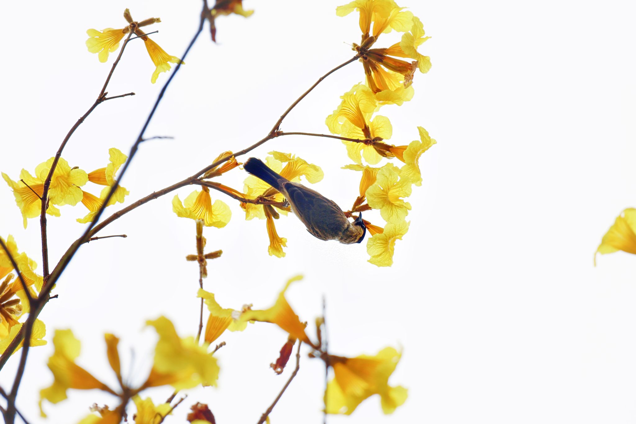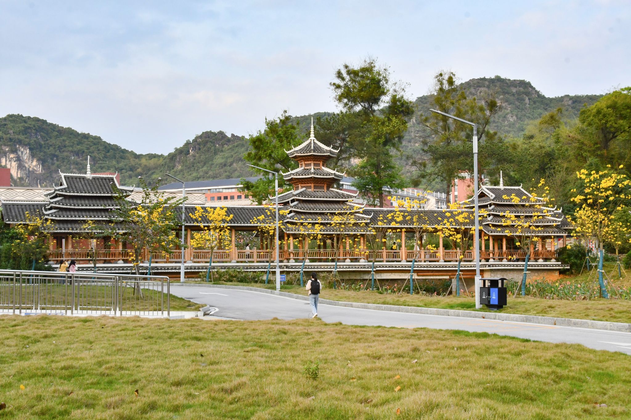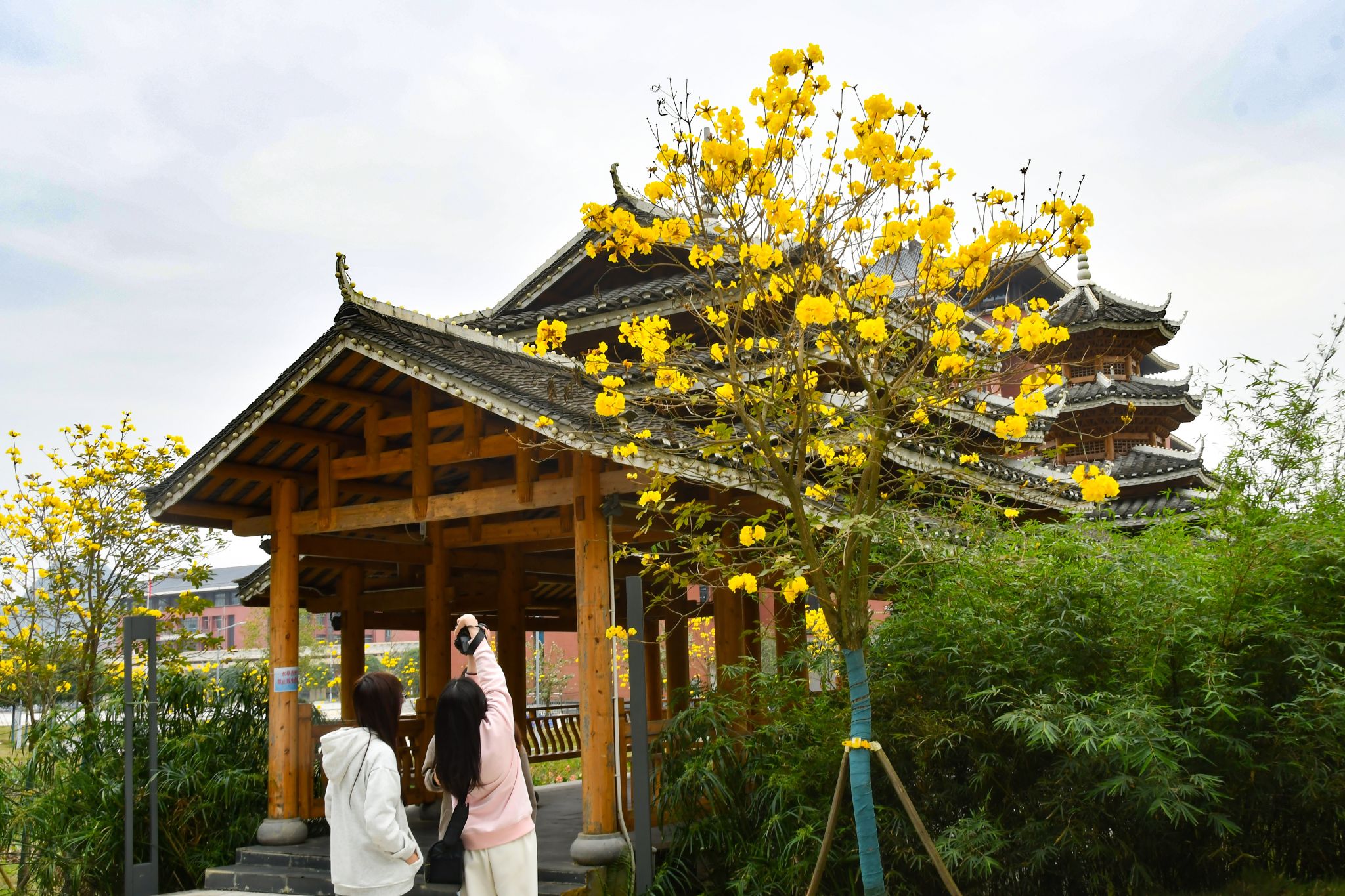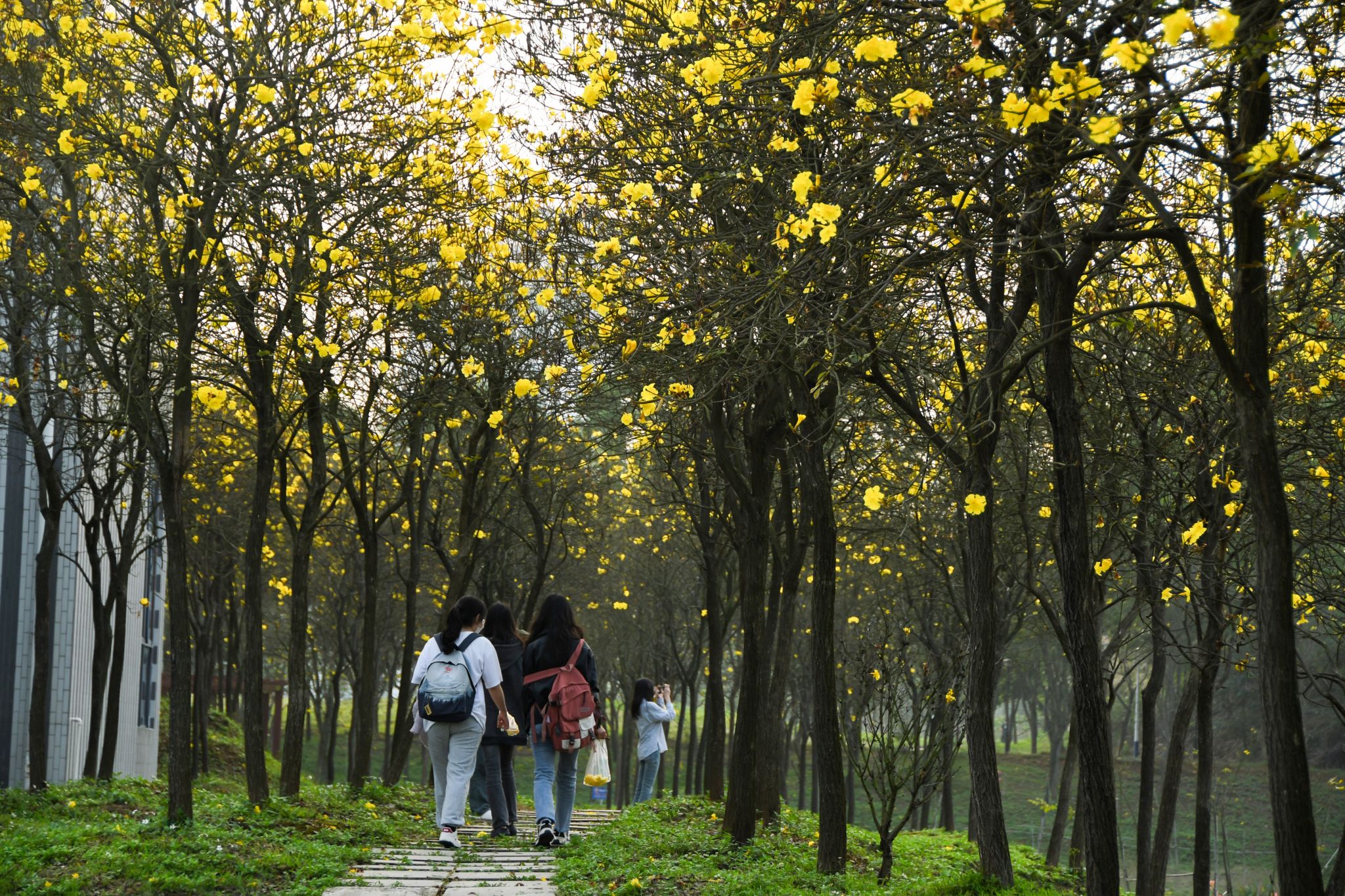 黄风铃木缀枝头,人影花影复重叠