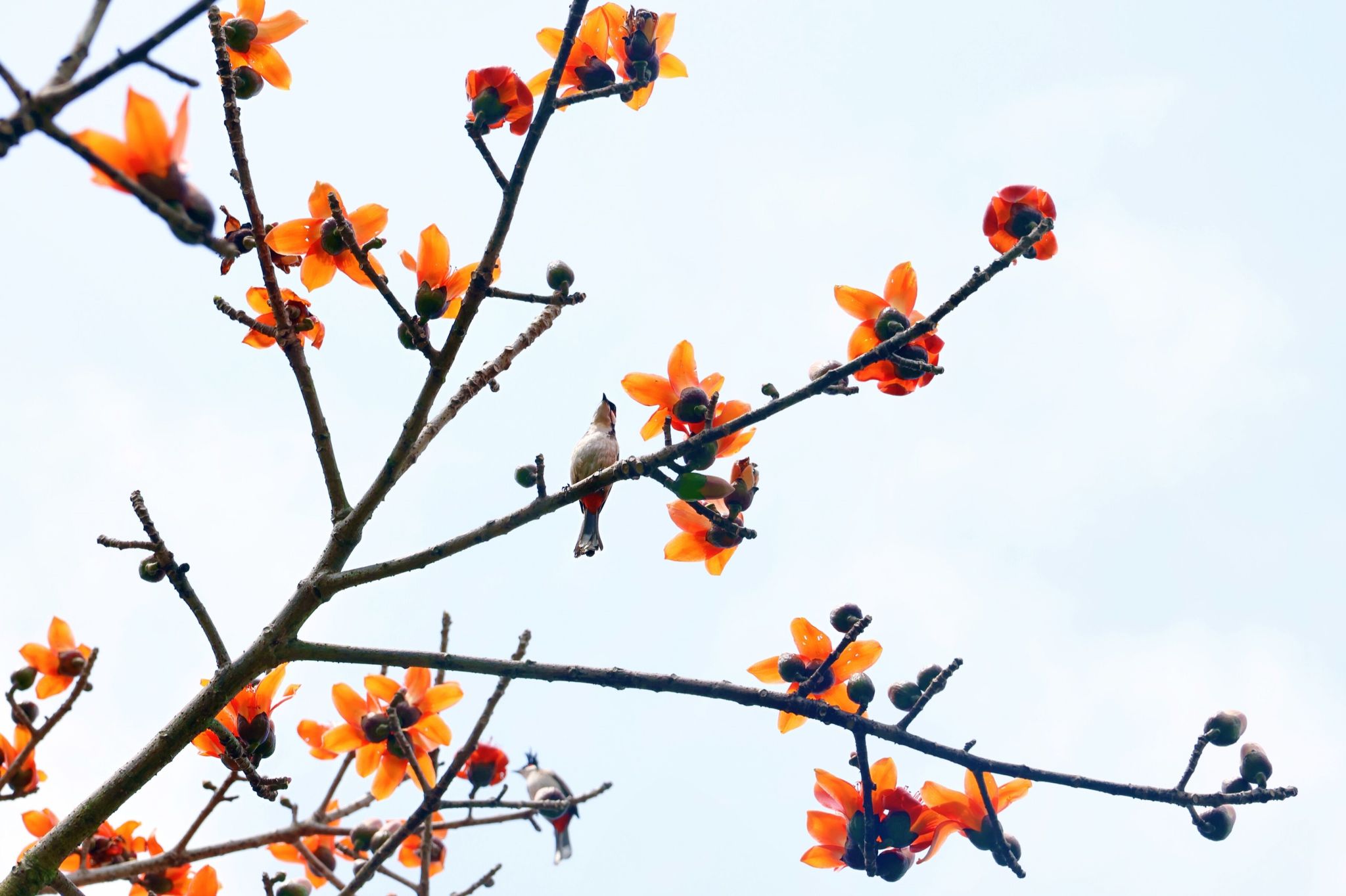 春风拂面花含笑,鸟儿休憩立枝头