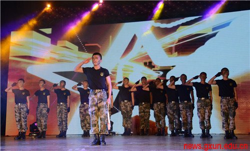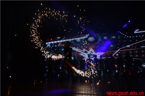 人武学院2014级学员军舞表演《青春士兵》把军事元素与街舞相结合,一名士兵出现在舞台中央,挥动手中燃烧着的双节棍,飞舞的火花给黑暗的舞台带来一丝光亮,展示了人武学院学子无所畏惧的精神风貌。