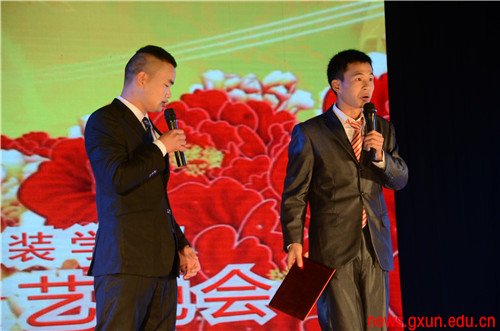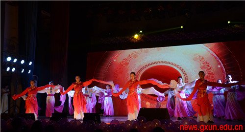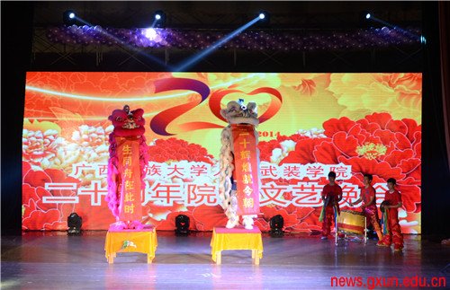 在铿锵的锣鼓声中,广西机电职业技术学院与南宁职业技术学院武术协会联袂表演的醒狮拉开晚会序幕。一红一白两头狮子在舞台上你追我赶,摇头摆尾,并送上“一生同舟在此时,二十辉煌就今朝”的真诚祝福。