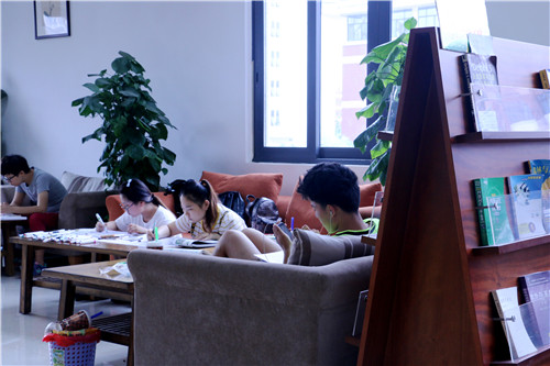 图书馆大厅内的书吧,为在图书馆学习的同学们提供奶茶、面包、蛋糕等饮料和食品,细小之处的设置为学习营造了一个轻松的环境。