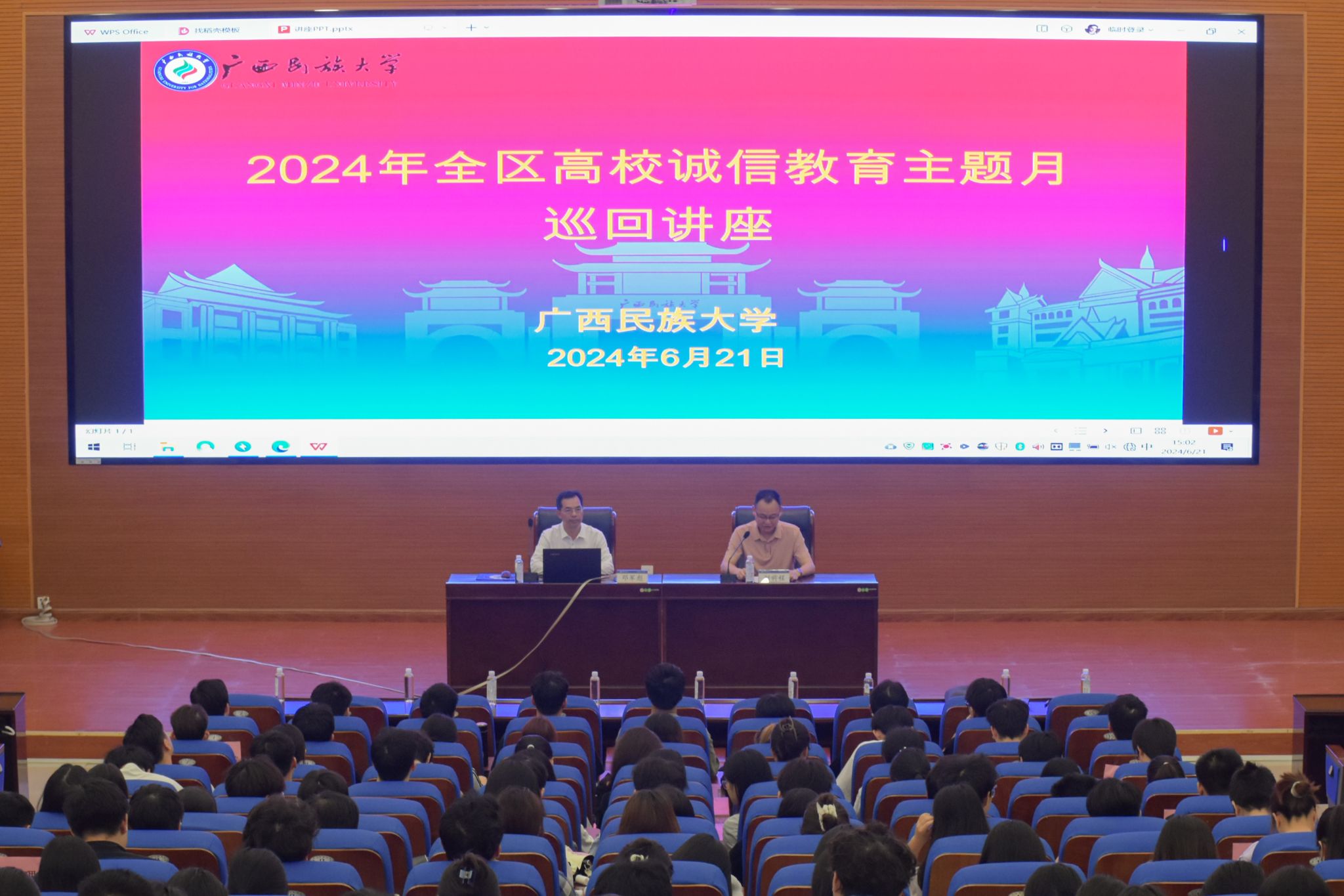 【大学生通讯社报道】6月21日,2024年全区高校诚信教育主题月巡回讲座在beat365英国官方网站思源湖校区明德楼101报告厅举行。讲座由南宁师范大学政策法规与发展规划处处长邓军彪主讲,学校学生工作部(处)副部(处)长刘前程主持。学校各学院师生代表参加讲座。