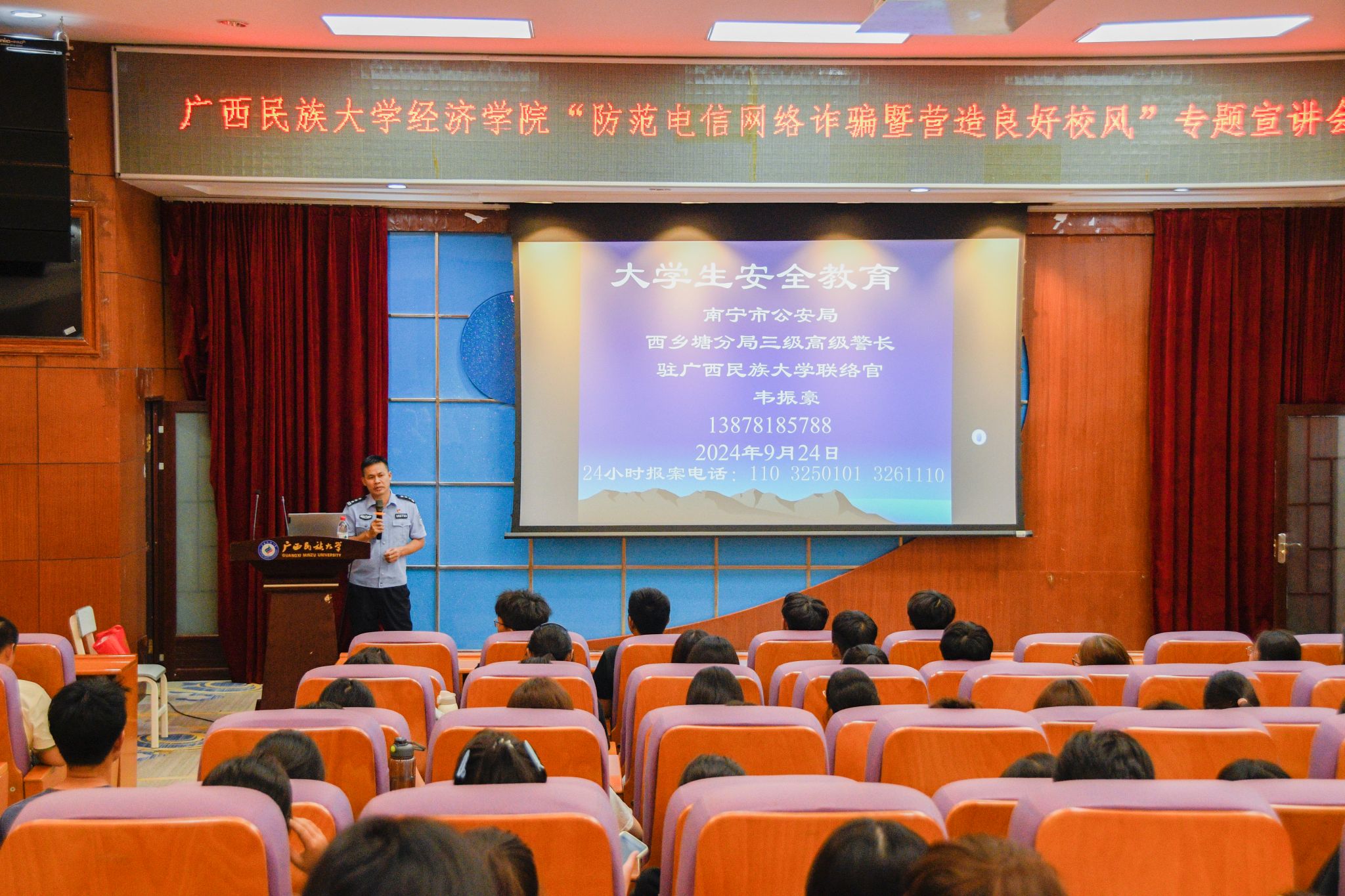 南宁市公安局西乡塘分局三级高级警长、驻beat365英国官方网站联络官韦振豪结合高校案例,阐述当前我国电信网络诈骗案件的严峻形势,详细介绍“断卡行动”,即打击为电信网络诈骗集团提供电话卡和银行卡的行为。同时,他讲述了电信网络诈骗案件的种类和防范方法,告诉同学们如何识别并防范各种类型的电信网络诈骗。