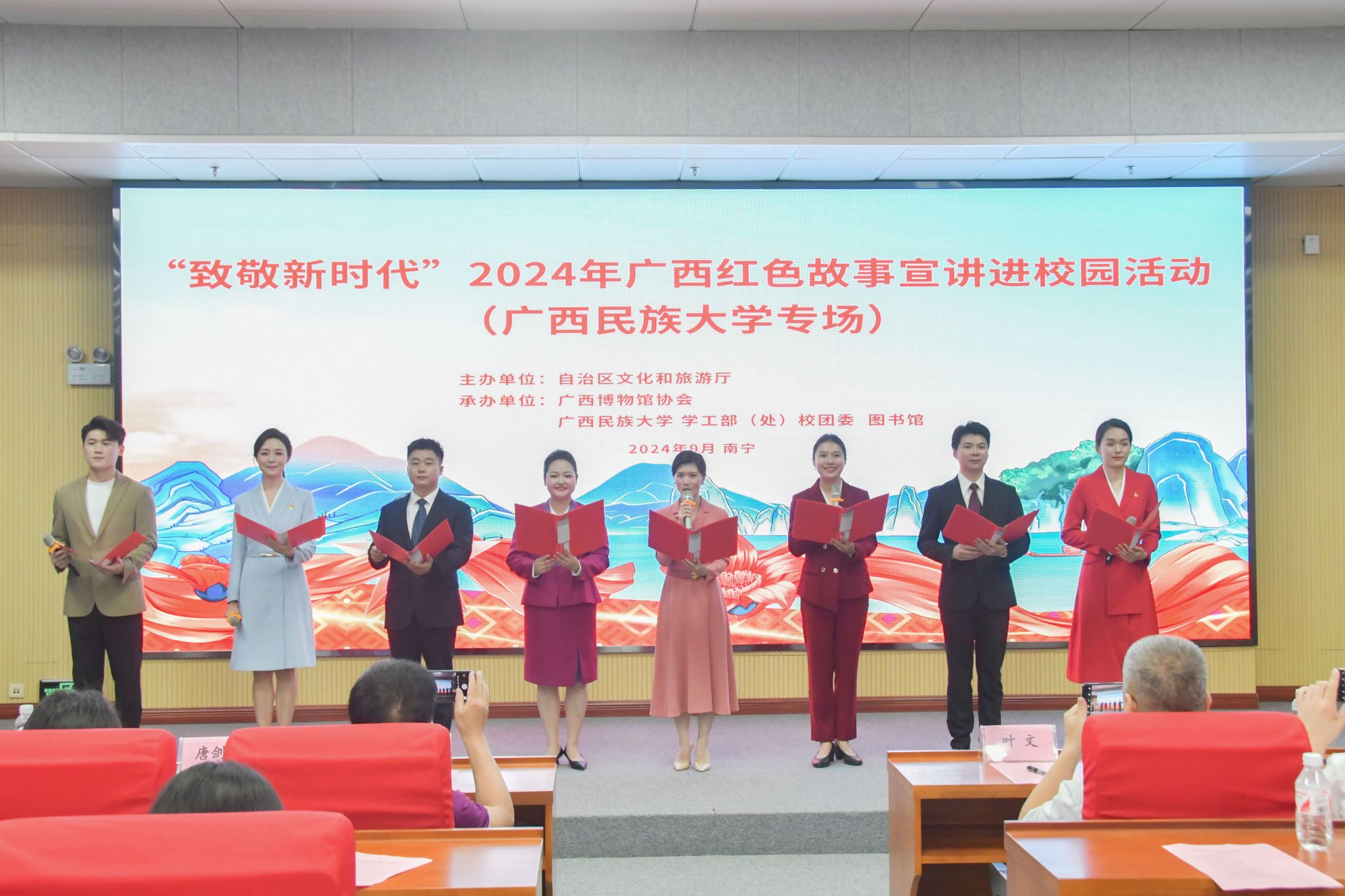 活动中,师生们共同观看了广西红色旅游宣传片,文旅厅革命文物处负责人为学生代表赠送《广西红色文化旅游图集》。“我们向全区同行倡议,做红色基因的坚定传承者……在红色旅游讲解员的光荣岗位上,用奋斗书写我们的多彩年华,让共和国的红色更加鲜艳。”活动在讲解员们的宣读中结束。