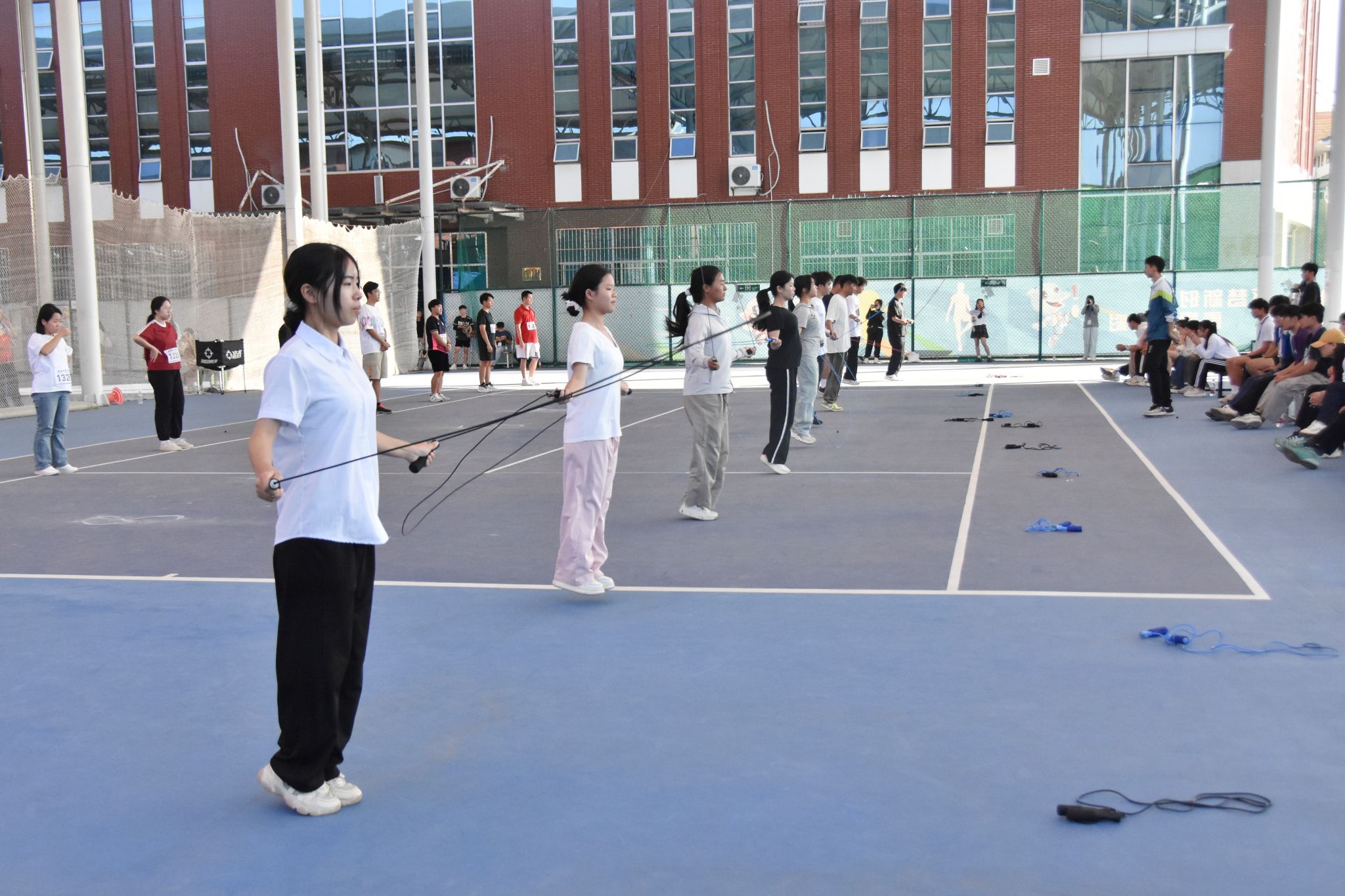 管理学院的10名运动员在比赛场地呈“一”字排开。随着裁判员一声令下,比赛正式拉开帷幕。管理学院的运动员迅速进入状态,双手紧握绳索两端,两臂屈肘抬平小臂,绳索快速旋转,甩出“唰唰”的破空声,脚步交替变换。在队员们的共同努力下,管理学院跳绳总次数全场最高,获得冠军。