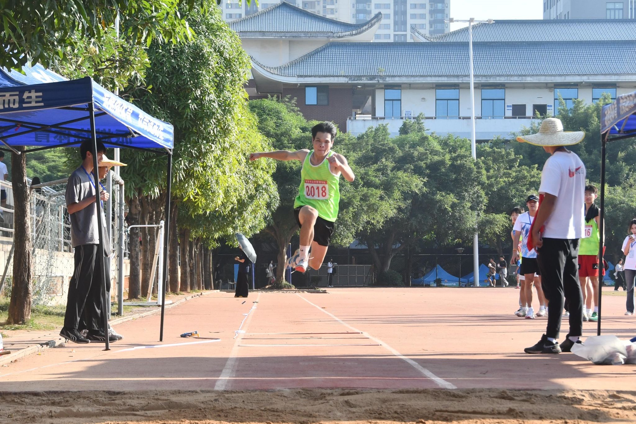 “卢晓锋准备!”裁判下令。卢晓锋立刻将视野锁定于正前方的跑道,压低中心,蓄势待发。裁判手中信号红旗落下,卢晓锋如离弦之箭飞出,搏尽全身力气冲刺,来到起跳板前,他的左脚猛地一蹬、跃起蓄势;接着屈膝送腿、跨步腾空;最后一次起跳,卢晓锋咬紧牙关,积聚全身的力量,高高跃起,双腿尽力向前伸展,动作一气呵成,最终双脚稳稳落地,沙粒飞扬。