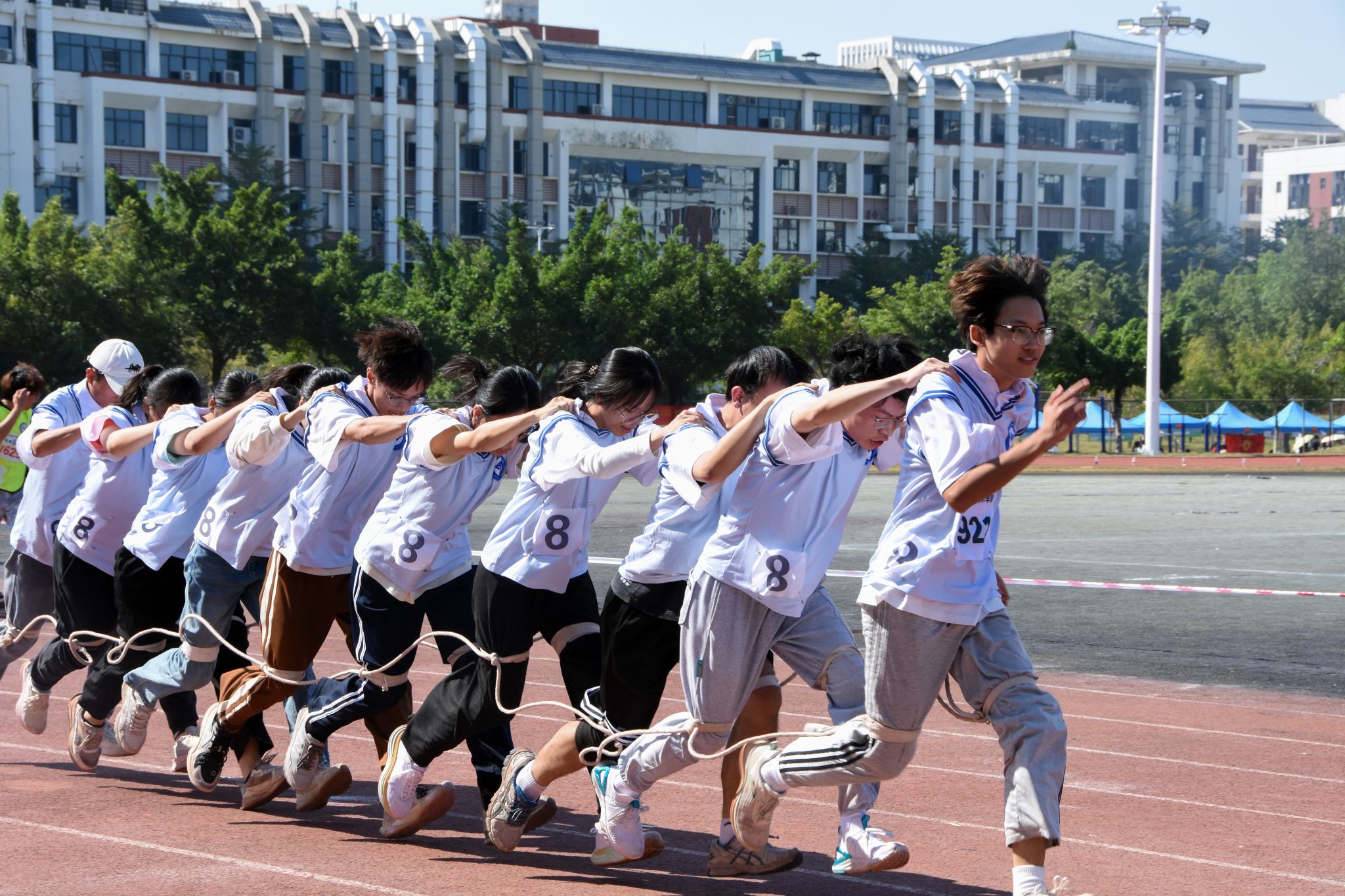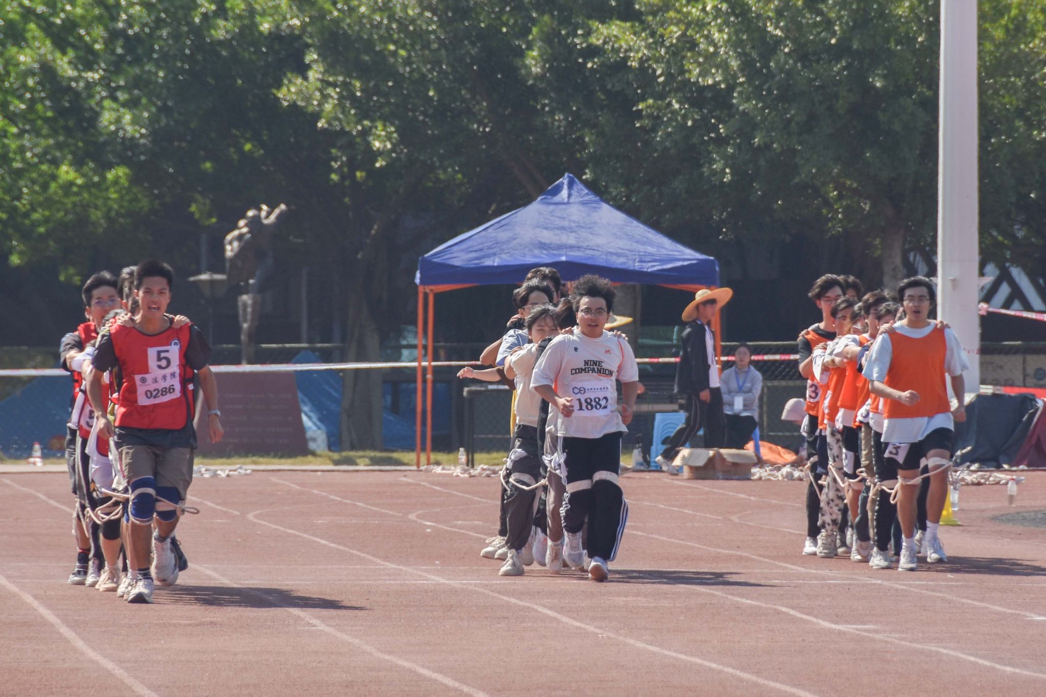 场外观众热情高涨,击鼓助威。各学院代表队身穿统一的制服站在候场区进行赛前准备。运动员们戴上套绳,走到起点线处,蓄势待发。裁判用手举起红色旗子,各参赛队伍立刻摆开姿势,目视前方,腿部呈弓步微弯,身体向前倾。枪声响起,比赛正式开始。