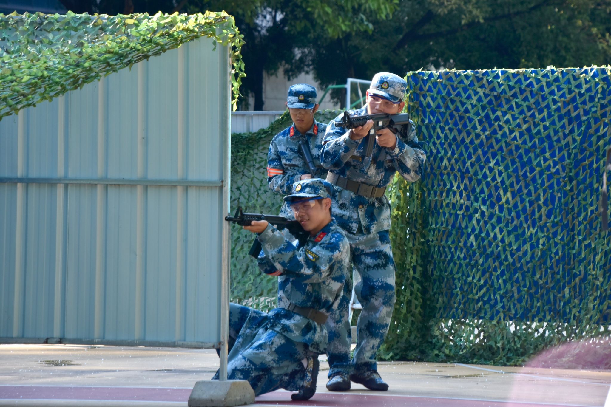 演练现场,新生们全副武装,手持模拟枪械,时而“迂回包抄”,时而“正面突袭”。他们全神贯注,沉着冷静,凭借眼神与手势传递战术意图,依托紧密配合实现攻防协作。模拟枪声此起彼伏,“战场”氛围紧张激烈。奔跑的背影、专注的目光、相互鼓励的呐喊,尽显蓬勃朝气与团队力量。
