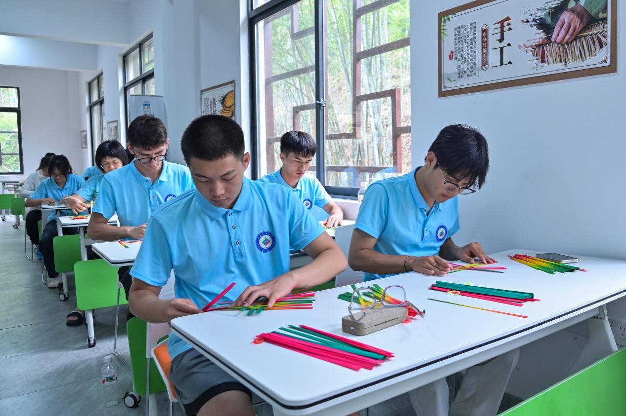 研学队伍前往宾阳竹编非遗传承基地参观,亲身体验非遗竹编制作,同学们执起柔韧竹篾,穿梭、调压、编制,将一片片竹条化作灵动小扇,在亲手编织中深刻感受非遗技艺所蕴含的匠心独运与智慧传承。