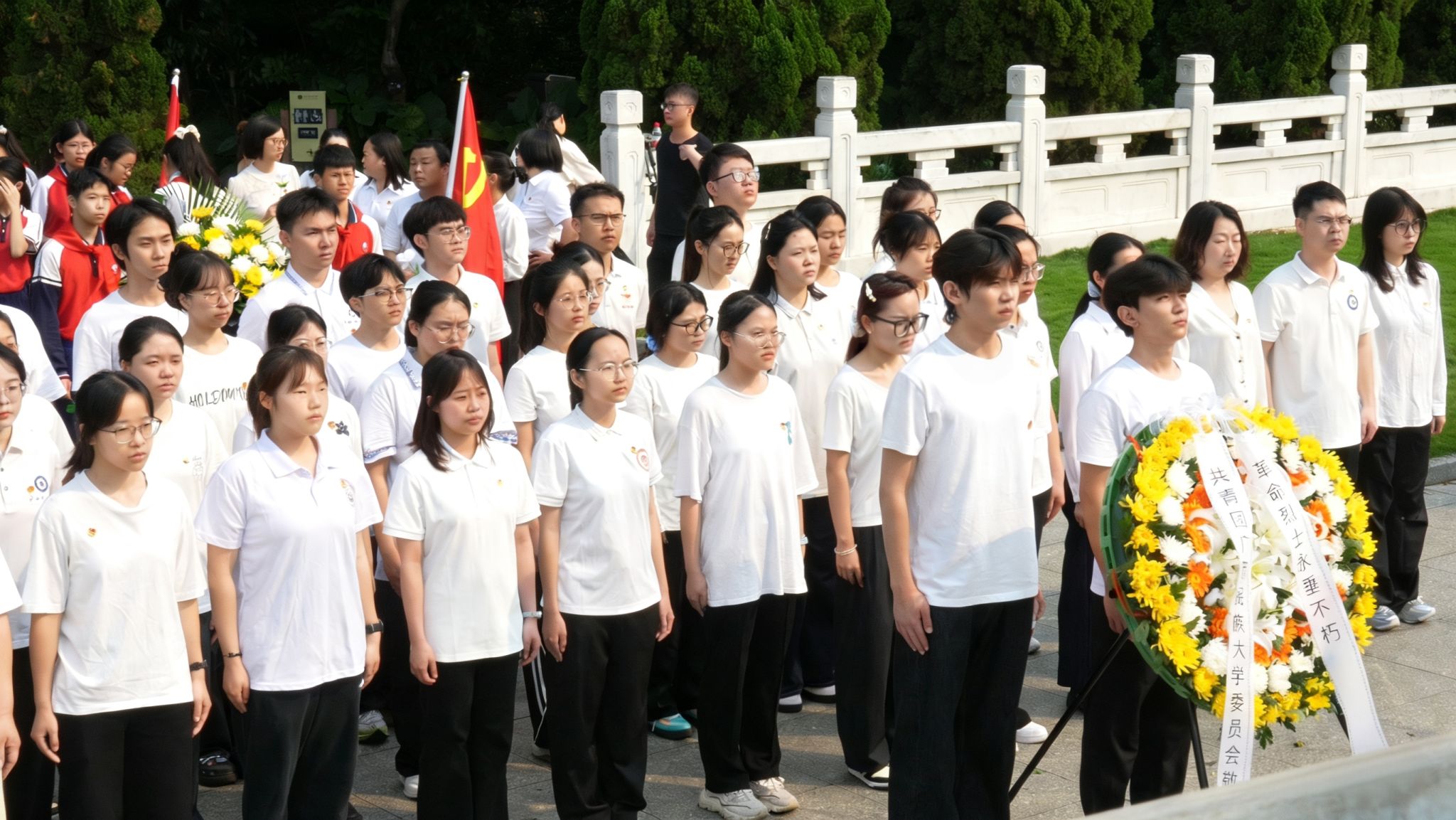 清晨的阳光洒落碑前,师生们肃然列队。敬献花圈,整理缎带,深深鞠躬,全体垂首默哀三分钟。春风不语,哀思绵长。