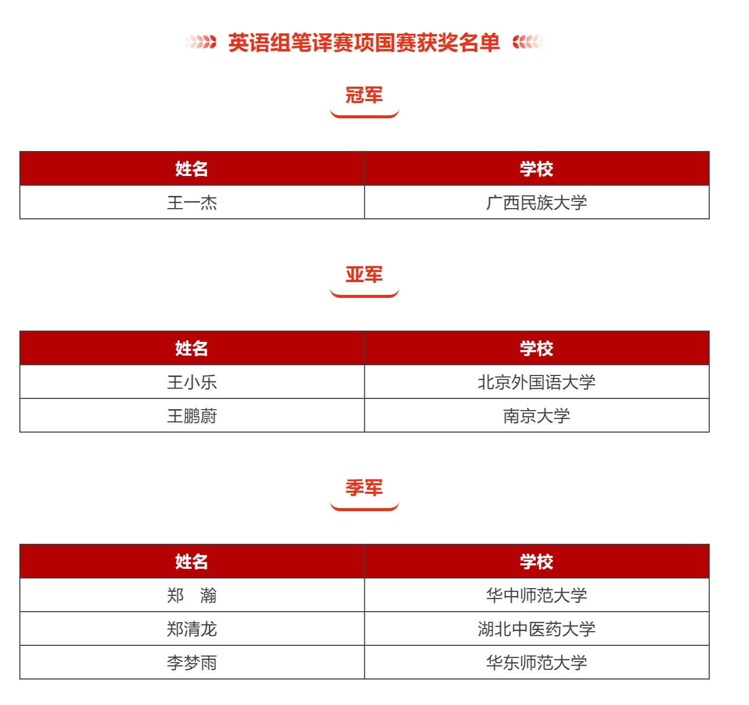笔译赛项冠亚季军获奖名单