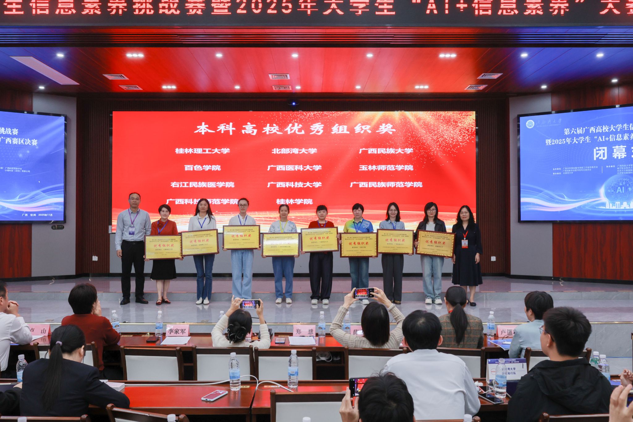 11月8日至9日,第六届广西高校大学生信息素养挑战赛暨2025年大学生“AI+信息素养”大赛广西赛区决赛在北部湾大学举行。beat365英国官方网站学子表现优异,再创佳绩:传媒学院王新颜、王思尹、黎烨组成的“专业团队”获本科生组二等奖;管理学院欧文婕、李舒琪、王庆林组成的“舒庆婕盟”队获研究生组二等奖;李格选、马辛辛、王璐瑶组成的“怎么都”队获得研究生组三等奖。学校荣获本科高校“优秀组织奖”,覃新清、饶文星、黄瑾一获评“优秀指导老师”。