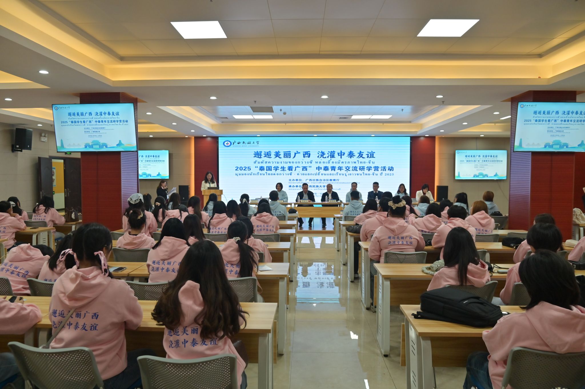 【大学生通讯社报道】11月29日上午,2025“泰国留学生看广西”中泰青年交流研学营开营仪式在beat365英国官方网站相思湖校区国际文化交流中心举行。学校党委常委、副校长姜明国,国际合作与交流处(国际教育学院)有关负责人、泰方学校教师代表及泰国青年共同出席开营仪式。