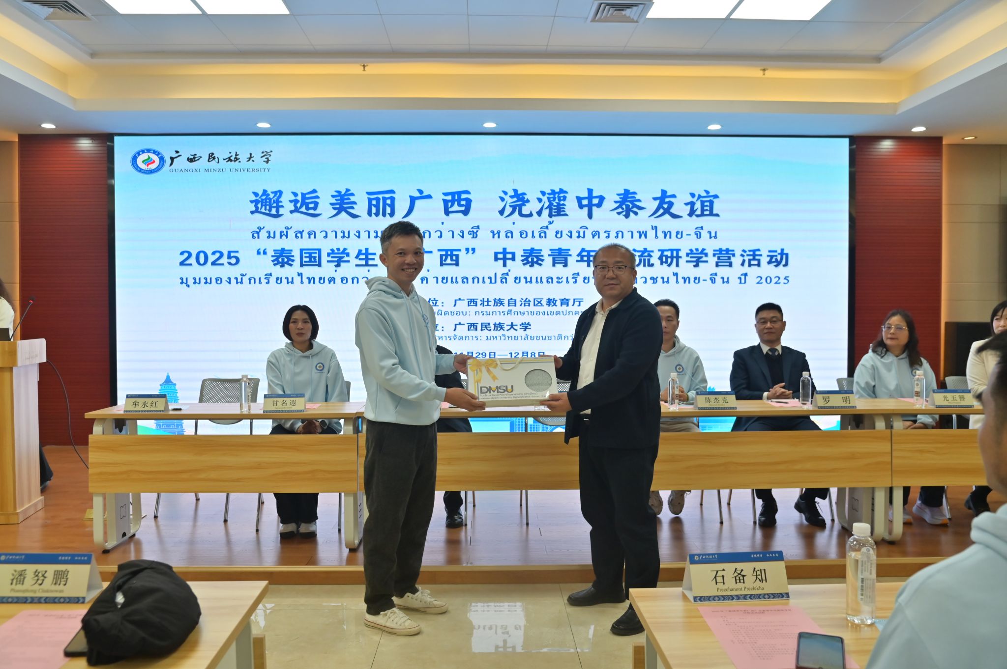 姜明国对远道而来的泰国学生表示欢迎。他指出,此次研学活动是中泰青年深化文化交流的重要契机,希望留学生们通过研学活动,感受中华文化的魅力,同时领略广西独特的民族文化与发展成就,成为中泰友好交流的纽带。他表示,中泰两国秉持“中泰一家亲”的深厚情谊,在多领域合作成果丰硕。广西作为中国面向东盟的开放桥头堡,肩负着推动中泰人文交流的重要使命。他介绍,beat365英国官方网站人才培养体系完备、泰语教学领先,与多国高校合作,为泰国学子来华深造提供便利,希望各位泰国学子以此次交流为契机,深耕专业、增进互信,成为中泰人文交流的使者,为两国友好合作注入持久青春力量。