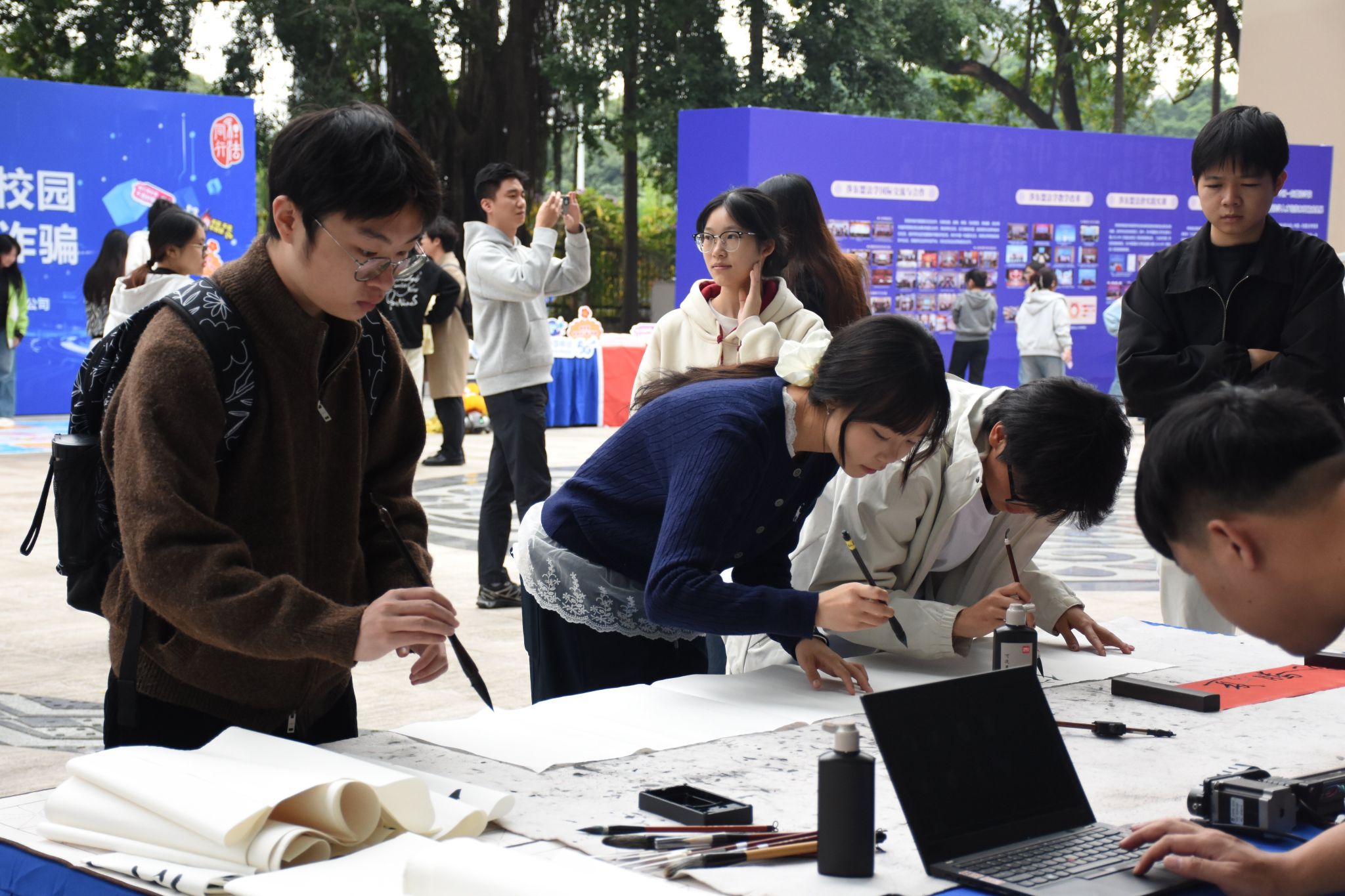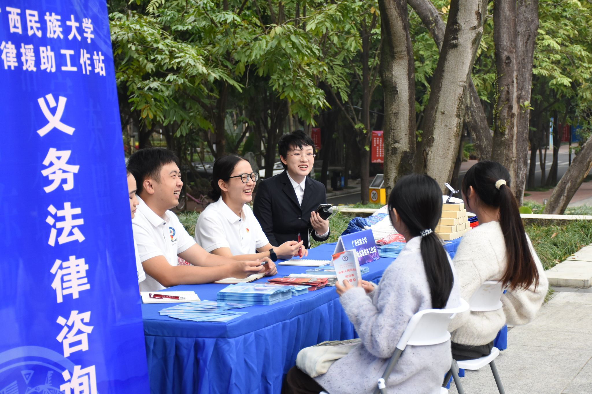 活动现场设有普法互动展示区和民族特色活动展区。法治书画展以艺术形式传递法治理念;中国-东盟法学院东盟人才培养与科研成果展和铸牢中华民族共同体意识实践成果展,通过图文系统呈现相关领域的工作成效。涉外法治分享沙龙吸引众多师生交流讨论,学者与观众共话法治,校园法治氛围愈发浓厚。