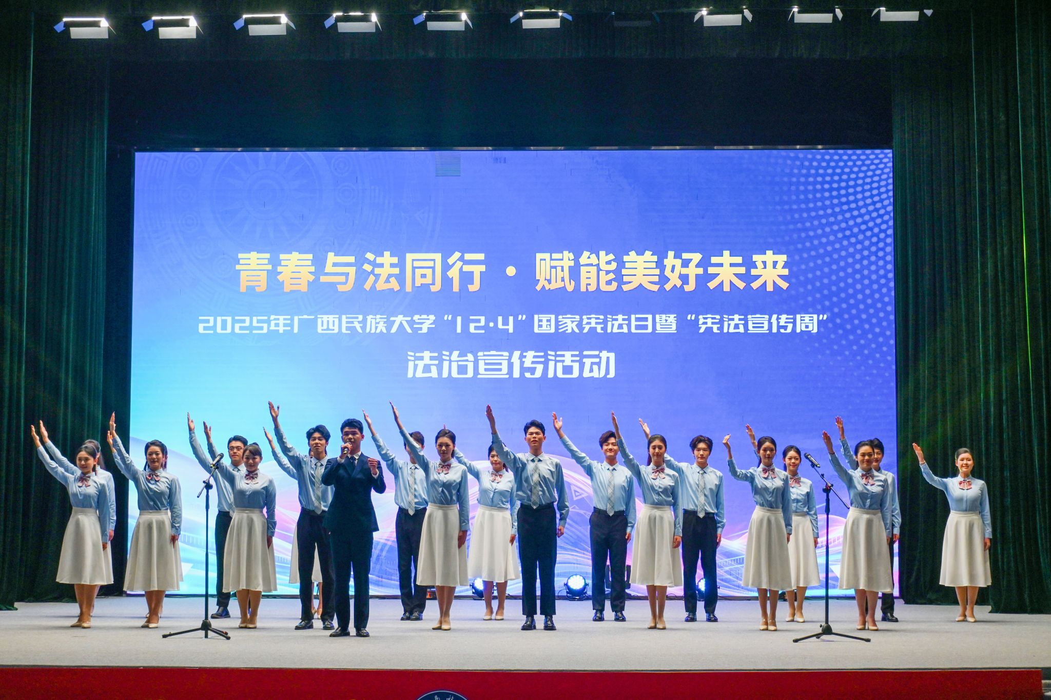 文艺汇演在《广西采茶舞》中拉开帷幕,朗诵《法治的光芒》深刻阐释了法治对国家治理和社会进步的重要意义。随后,陈铭彬带领全体在场师生进行庄严宣誓。歌伴舞《不忘初心》将现场气氛推向高潮,表达在法治道路上坚守初心、砥砺前行的坚定信念。演出结束后,现场开展了普法知识问答,观众踊跃参与,在轻松活泼的互动中巩固了法律知识,深化了法治观念。