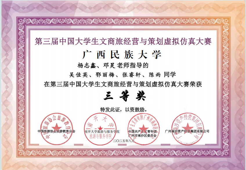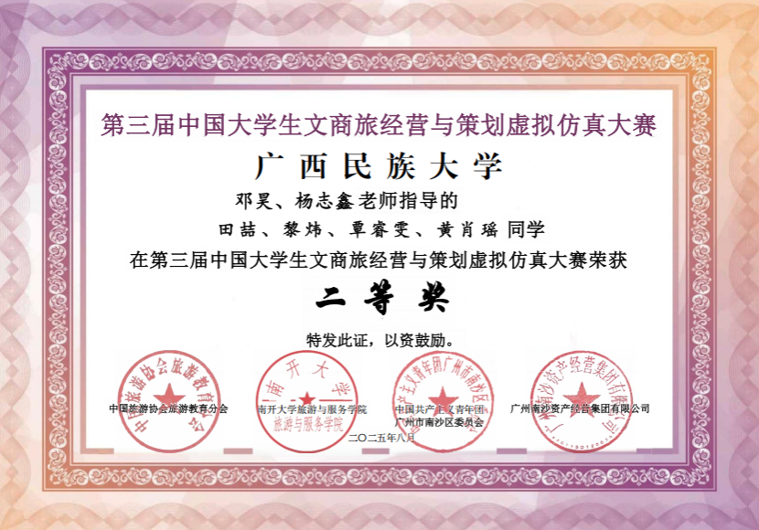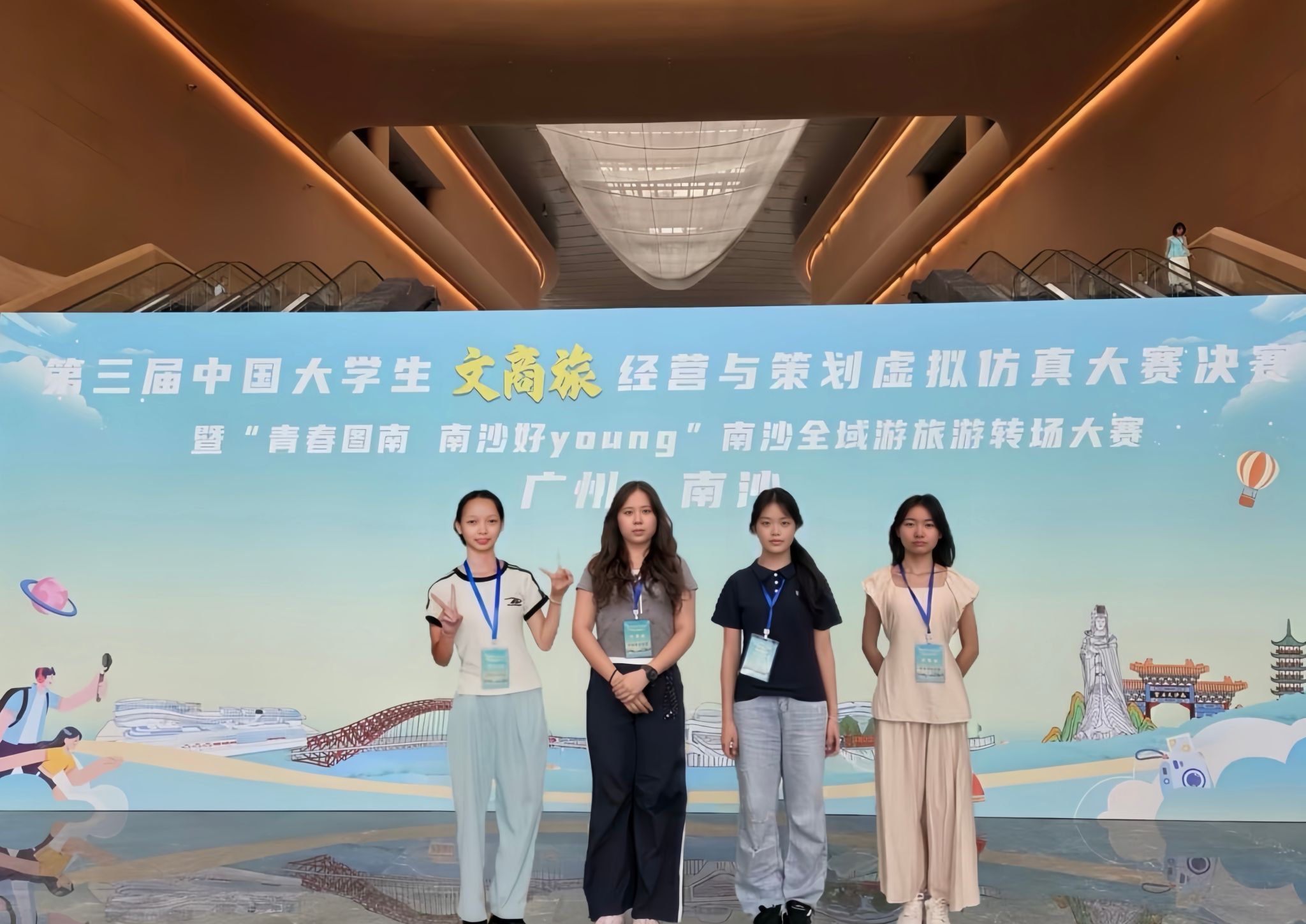 近日,第三届中国大学生文商旅经营与策划虚拟仿真大赛全国总决赛在广州南沙举行。beat365英国官方网站管理学院学子组成的两支队伍表现优异,斩获全国二等奖1项(排名全国第21)、三等奖1项、实践特等奖1项。在同期举办的“青春图南 南沙好young”南沙全域游旅游转场大赛中,两支队伍再获2项优胜奖,邓昊和杨志鑫两位教师获评“优秀指导教师”。