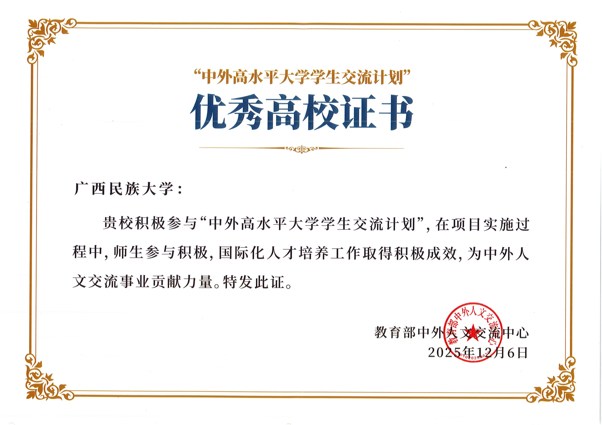 “中外高水平大学学生交流计划”(简称“中高计划”),是由教育部中外人文交流中心、澳大利亚高等教育联盟、北京中教人文国际文化交流有限公司等机构,联合QS世界300强、专业学科100强的国外知名大学及国内高水平大学共同发起的中外人才联合培养项目。学校中高计划项目于2022年开始立项招生,系广西最早开始实施“中高计划”的高校,首批合作院校为澳大利亚的昆士兰大学和麦考瑞大学。2025年,学校成功申报并获批6个新项目,包括2个“2+2”本科联合培养项目和4个“3+2”硕士联合培养项目。