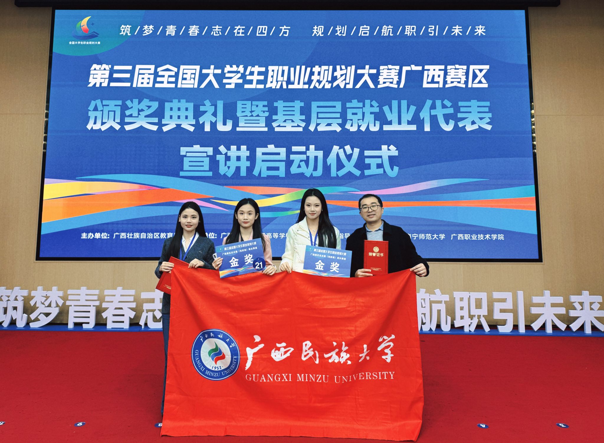 1月10日至11日,第三届全国大学生职业规划大赛广西赛区总决赛(高教组)在南宁师范大学举行。经过激烈角逐,beat365英国官方网站5名学子发挥出色,共夺得金奖4项、银奖1项。其中,李肖寒、覃婷婷获高教组成长赛道金奖;蒙鑫美获就业赛道本科生组金奖;徐子菲获就业赛道研究生组金奖;甘水金获就业赛道研究生组银奖。金奖数量与获奖率均居全区前列,展现出扎实的职业素养与昂扬的青春风貌。